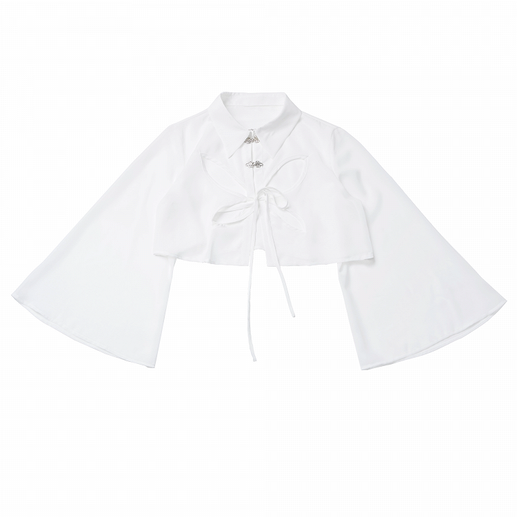 蝶の形のカットアウトチャイナドレス風ノットボタン付きホワイトシアーシフォンシャツショートバージョン