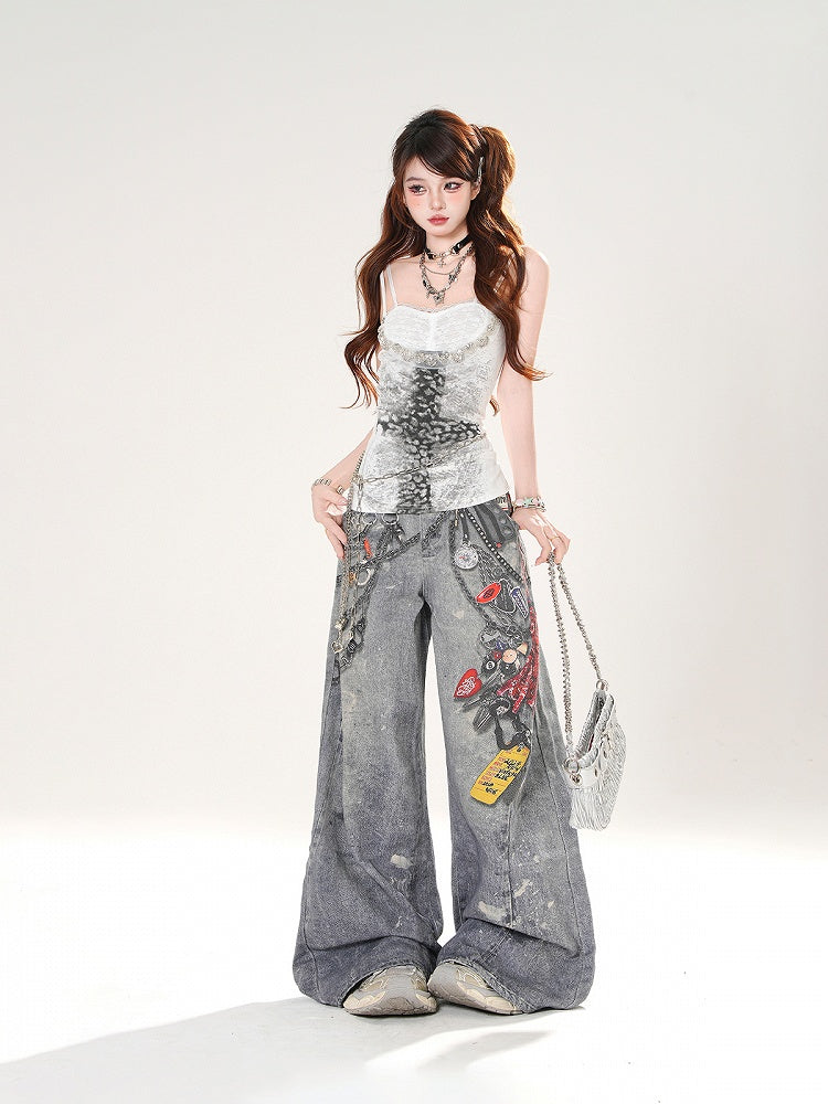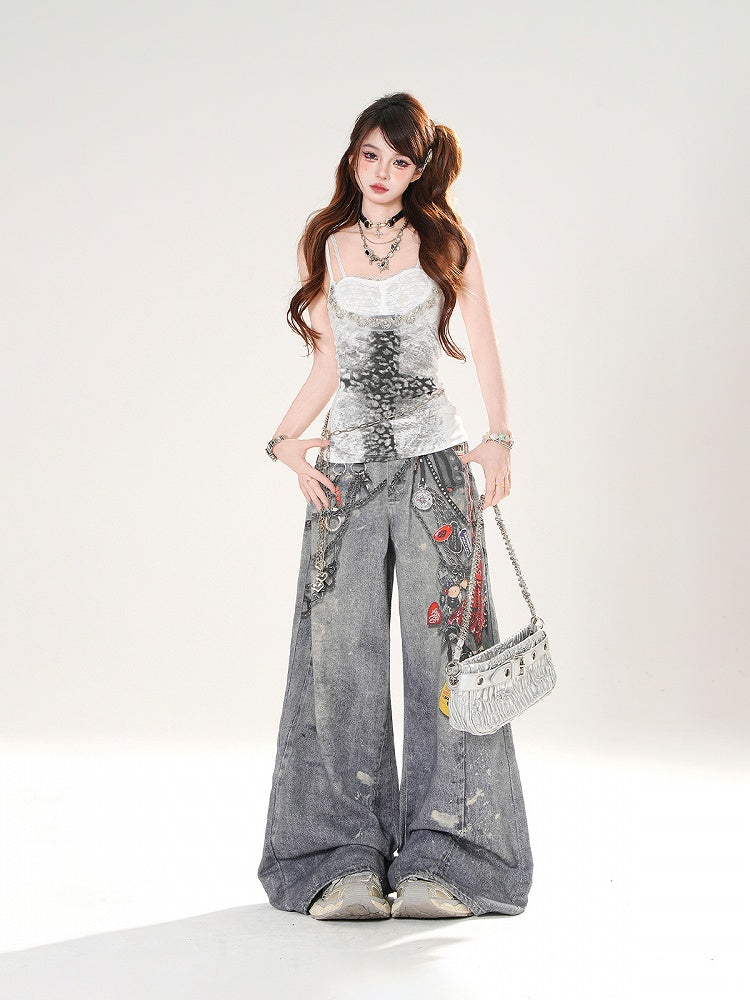 キャミソールトップ フェイクグレー/ホワイト スウィートハートネックライン クロスプリント