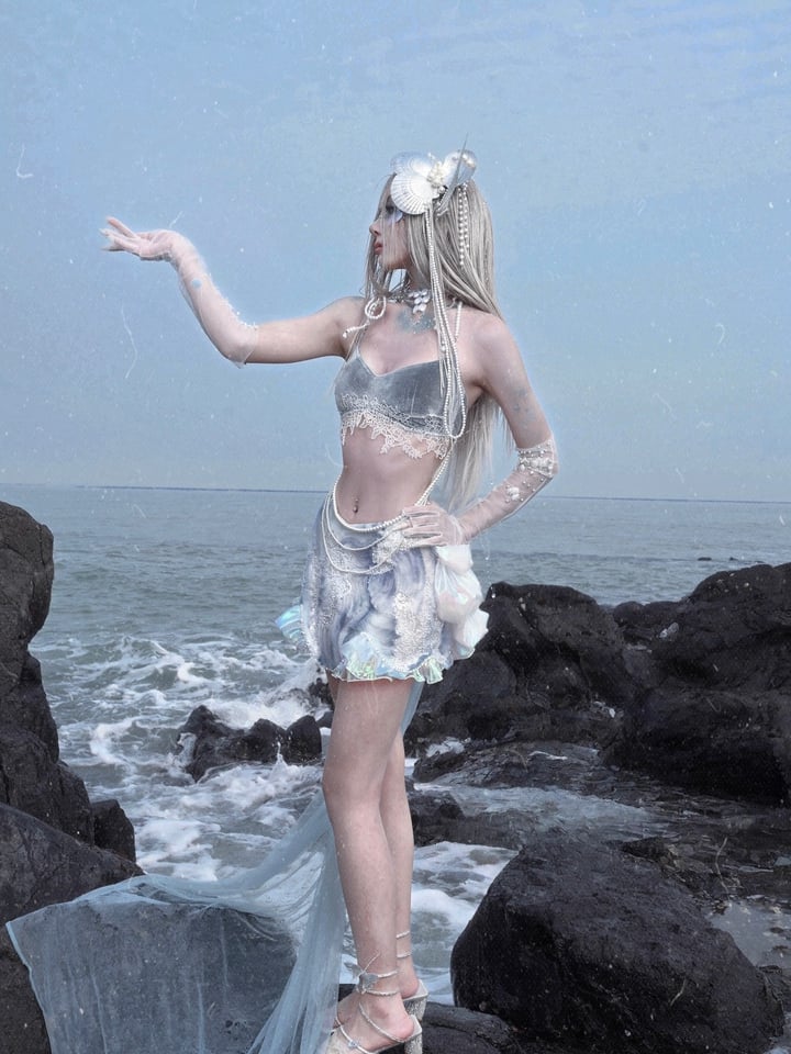 レースアップリケ付きダスティブルーベルベットキャミソール(取り外し可能なビーズチェーン付き)
