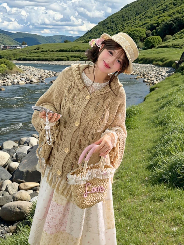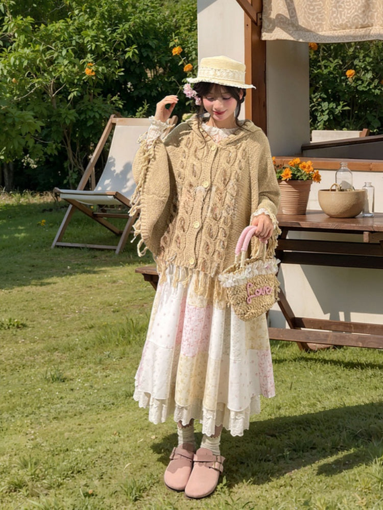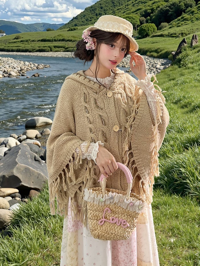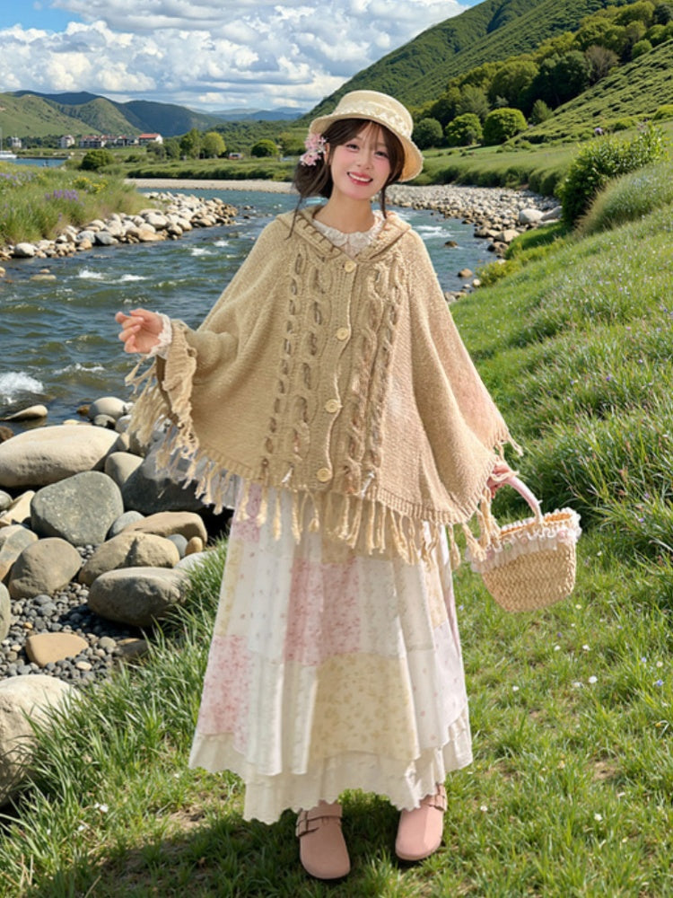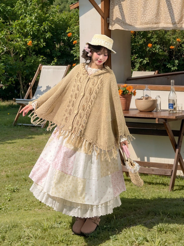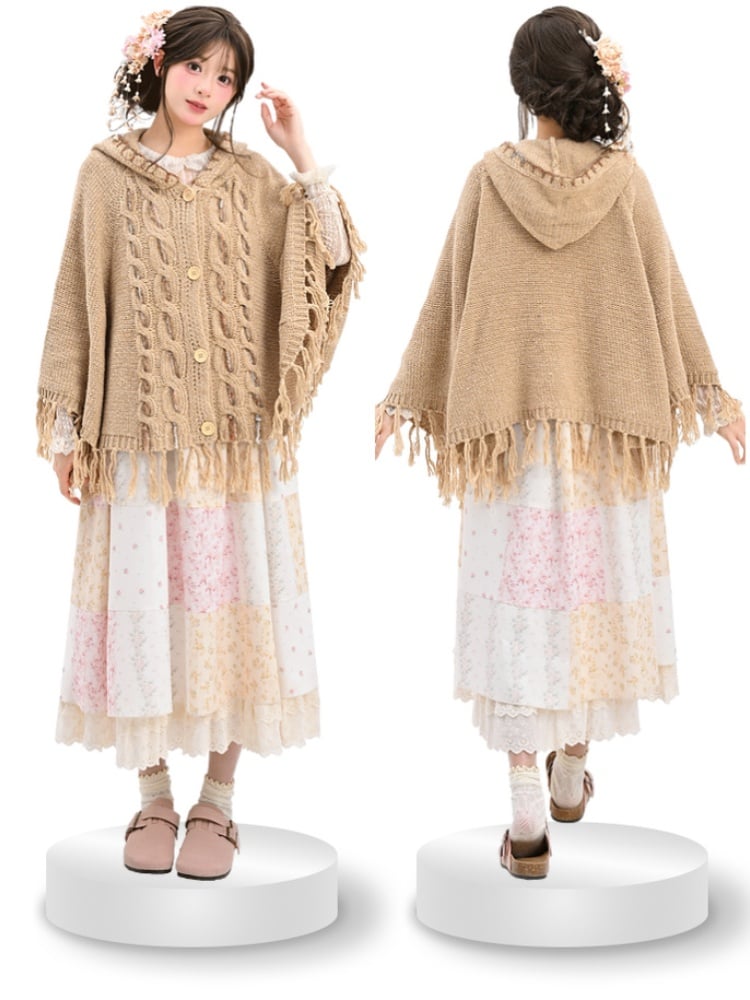 カーキ色のニットフード付きケープ(タッセルヘム付き)