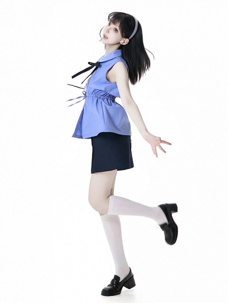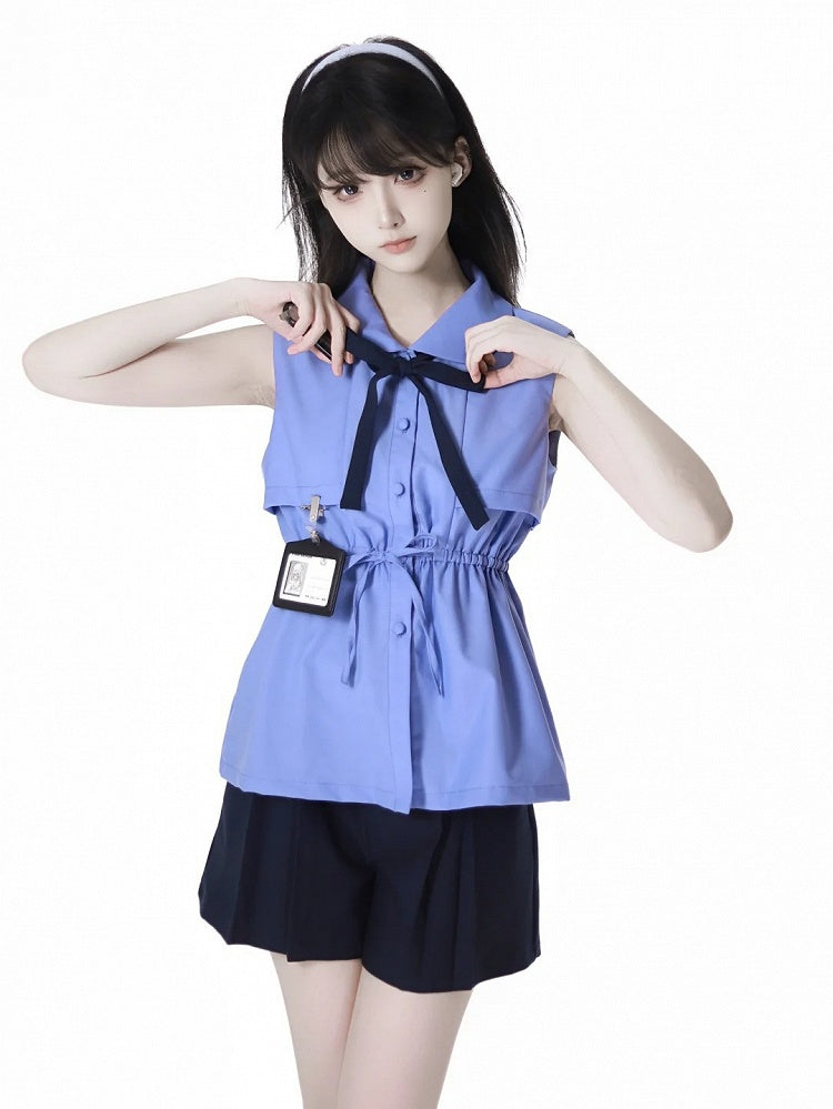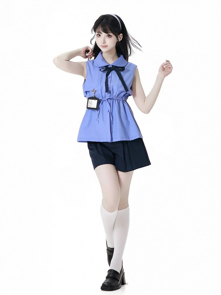 蝶ネクタイとカードホルダー付きブルーピーターパンカラーノースリーブシャツ