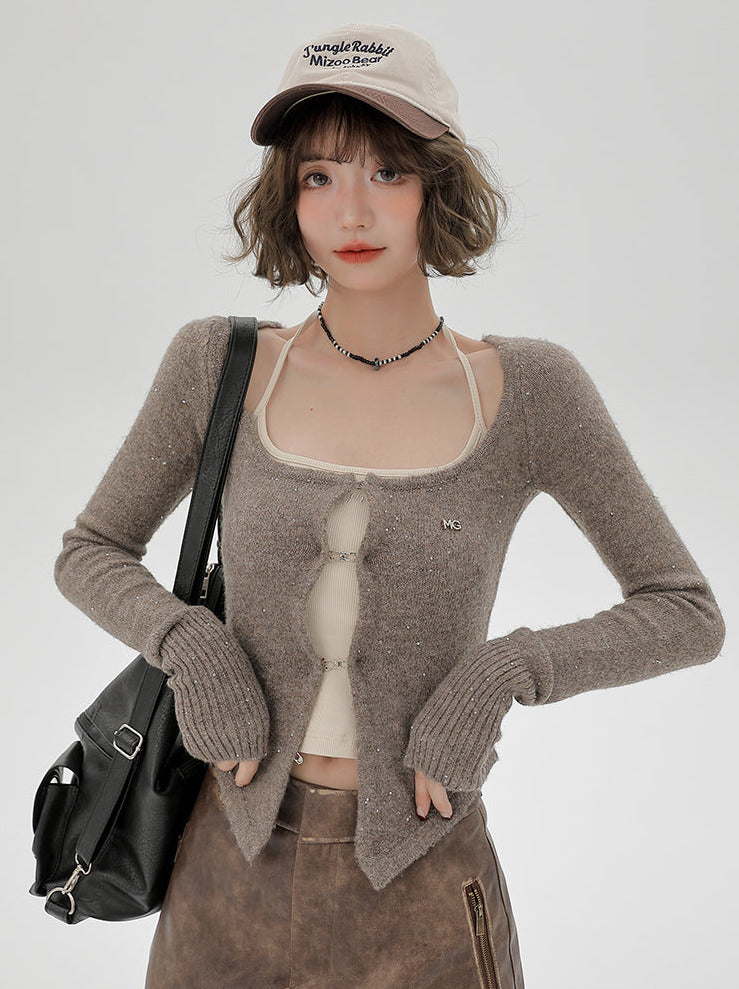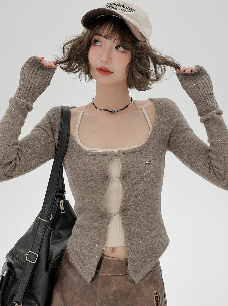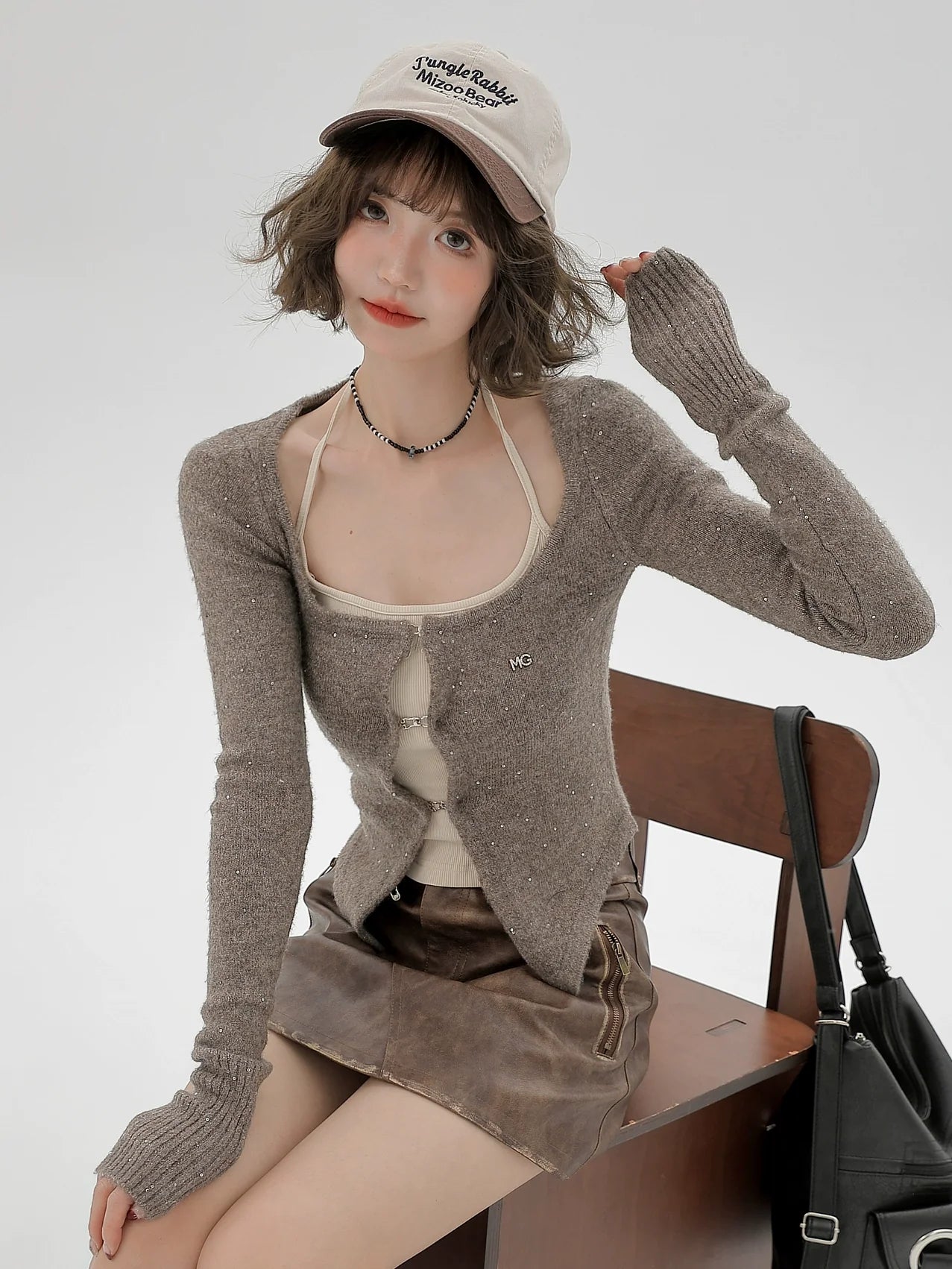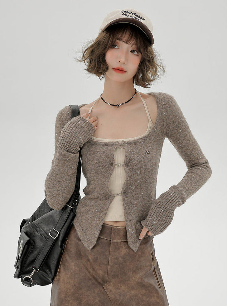 この愛らしいカーディガンを着て、周りの視線を釘付けにしましょう!レトロなサスペンダーデザインがヴィンテージ感を添え、スリムで光沢のある素材が美しいシルエットを演出します。どんなシーンにもぴったりな、アメリカンテイストのこのカーディガンは、ワードローブの定番アイテムになること間違いなしです。