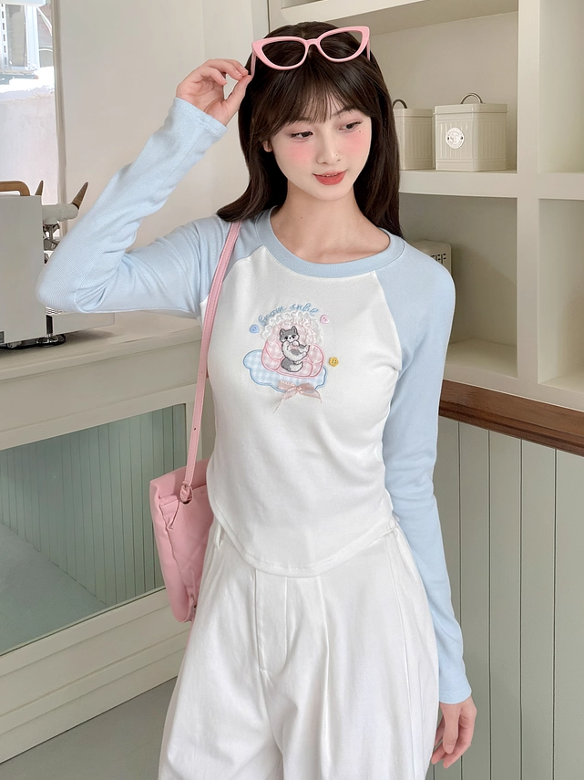 漫画のキティ刺繍、青と白のカラーブロックデザイントップス