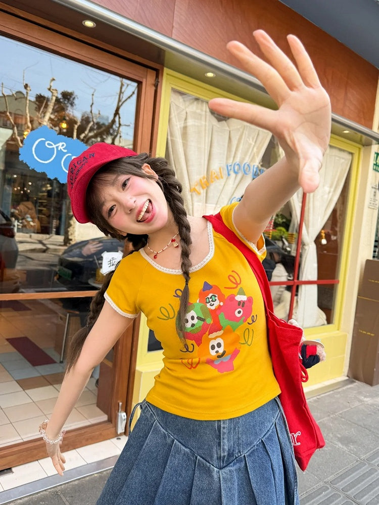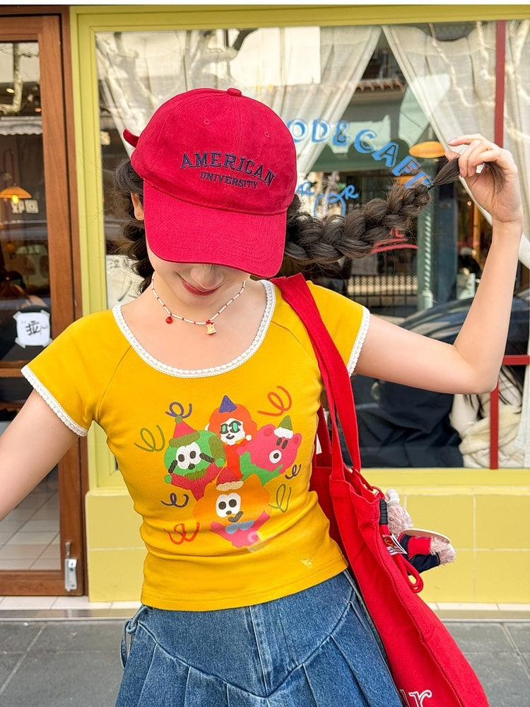 ジンジャー ラウンドネック レーストリム 漫画プリント Tシャツ