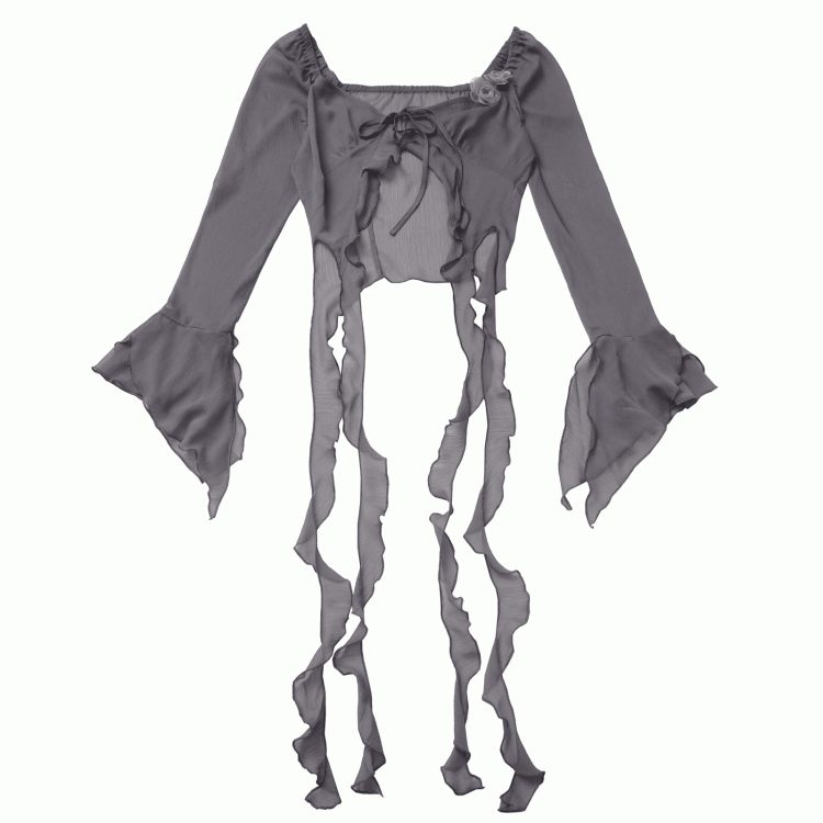 グレーのカスケーディングフリルアクセントのチャイナドレスシフォントップ、花柄ブローチ付き