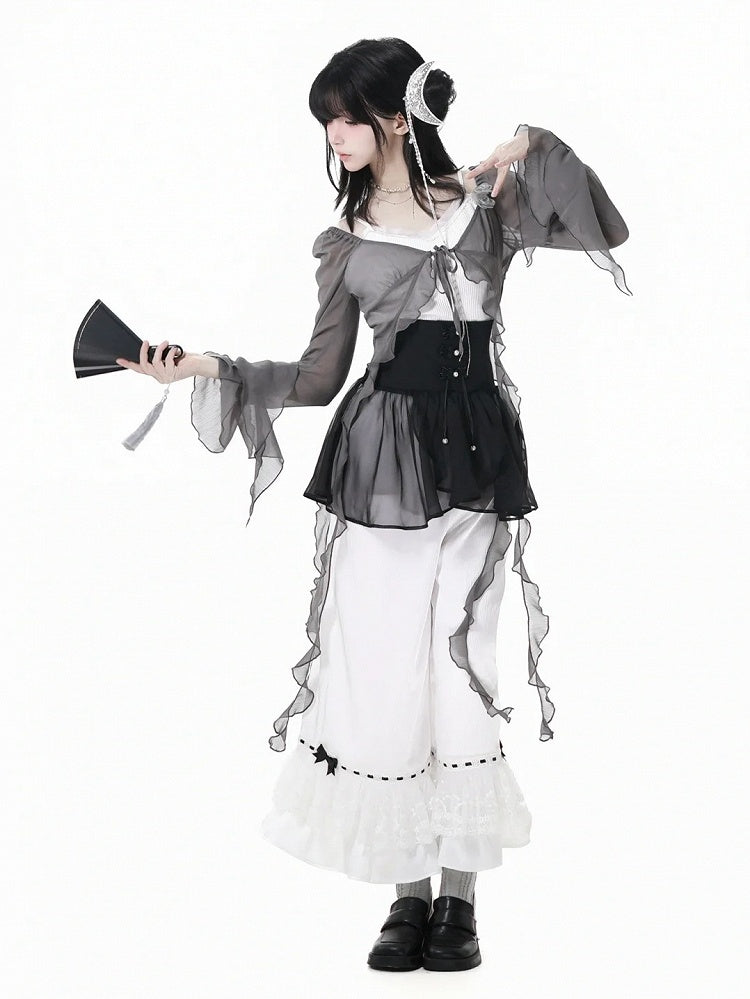 カスケードフリルアクセントのチャイナドレス、花柄ブローチ付きシフォントップス、グレー