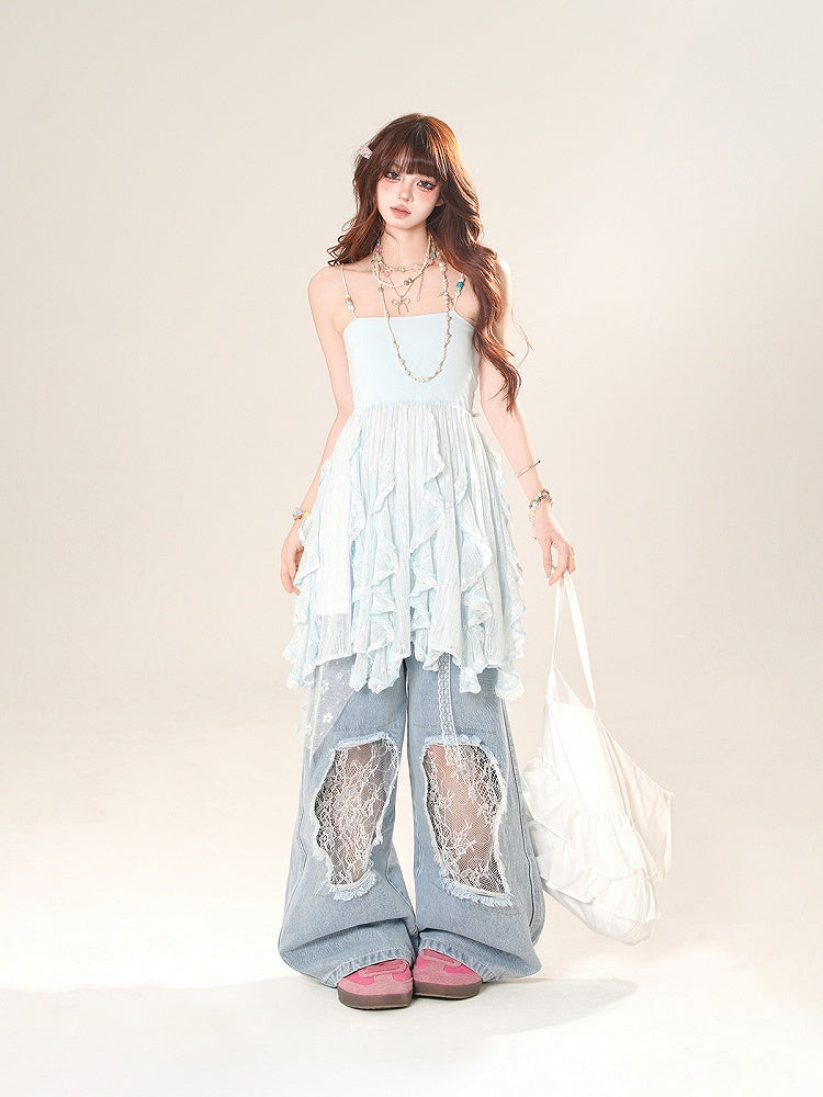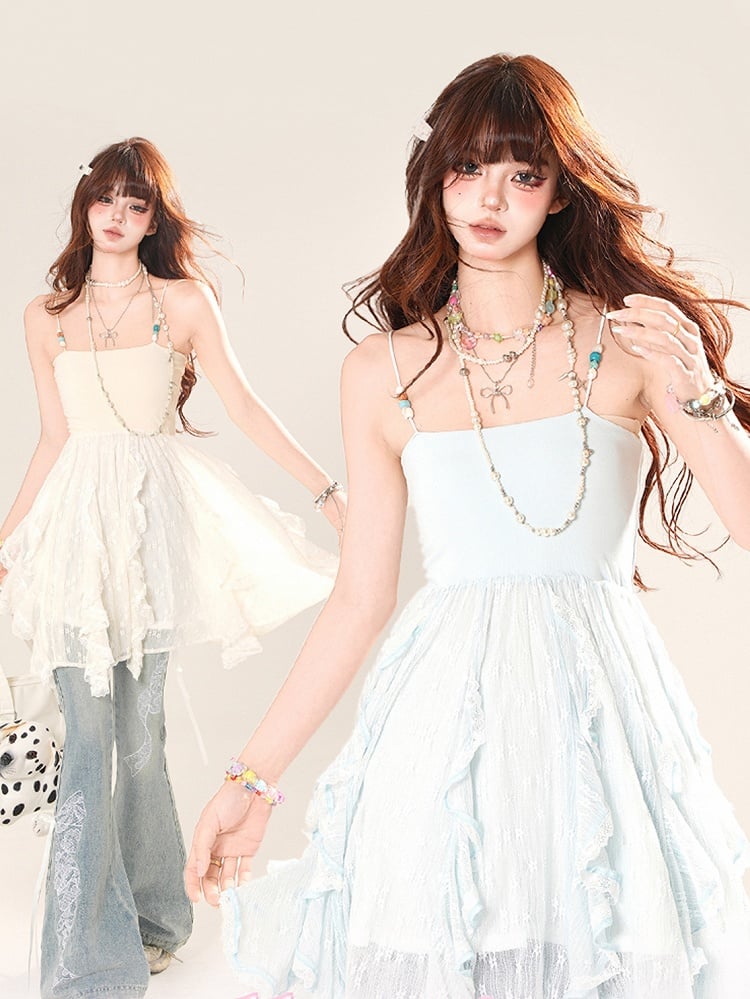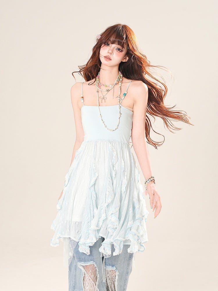 カスケードフリルアクセントレースキャミソールトップ ブルー/アプリコット