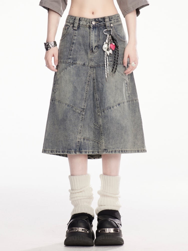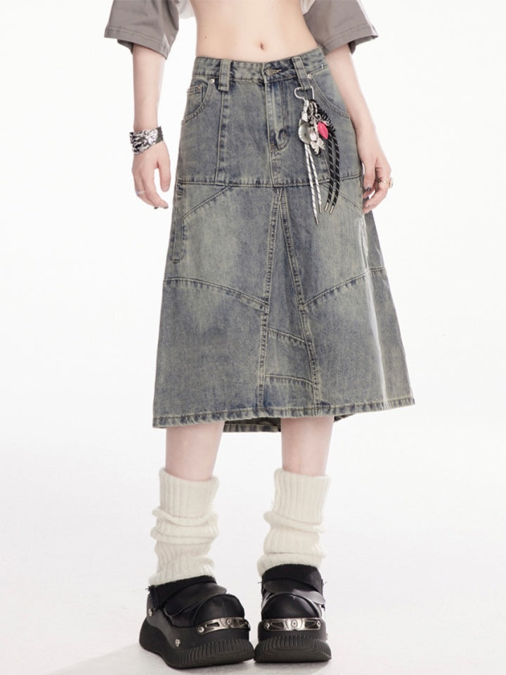 ブルーのローライズ フェードウォッシュ ダメージデニムスカート(チャーム付き)