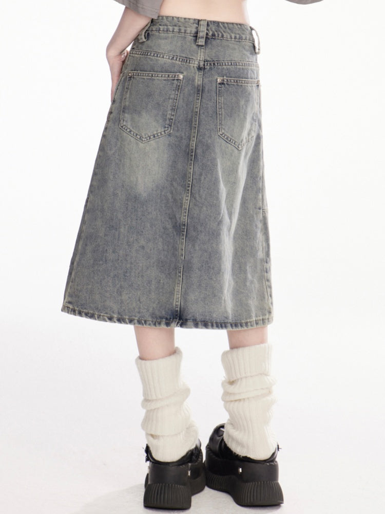 チャームフリーブルーローライズフェードウォッシュダメージデニムスカート