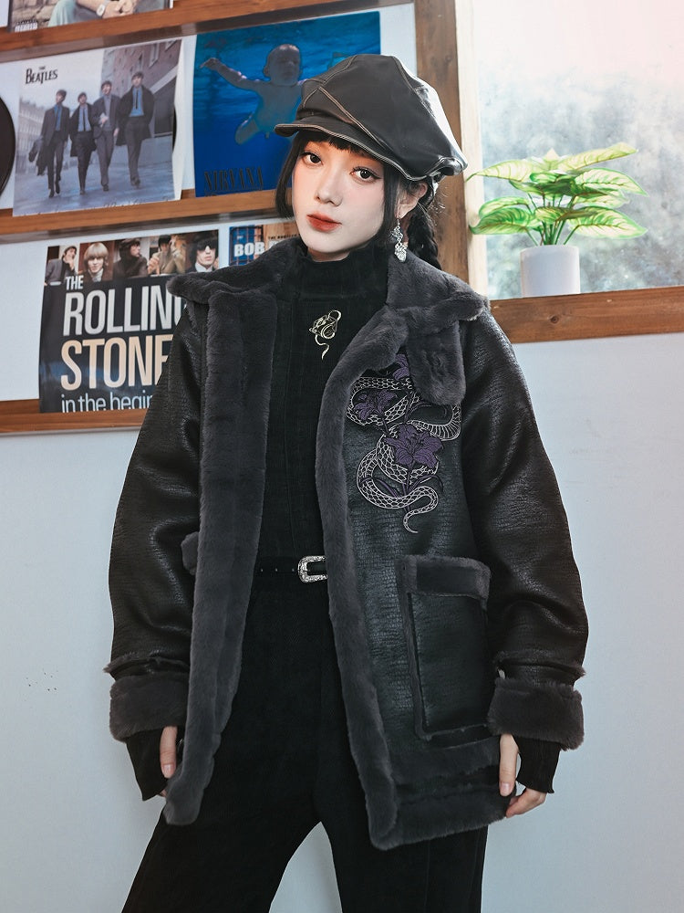 Black Cheongsam Gradient Dye Thumbhole Cuff Top with Snake Embroidery & High Collar