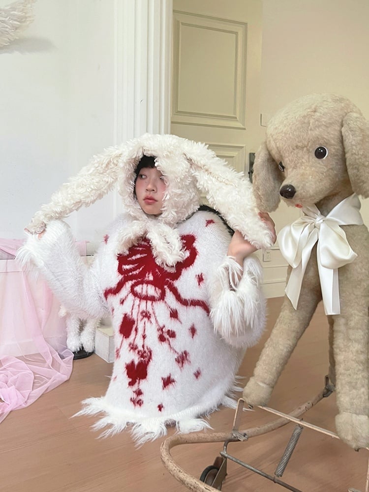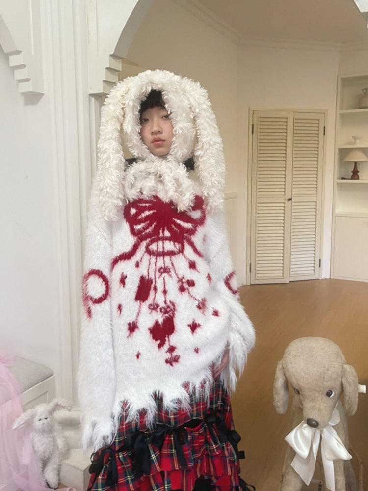 Chime Jacquard and Wind Cozy White Fuzzy Sweater with Distress Trim and Bow