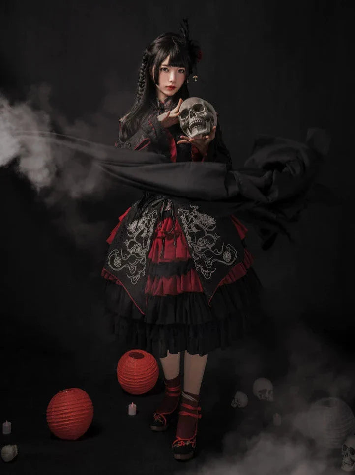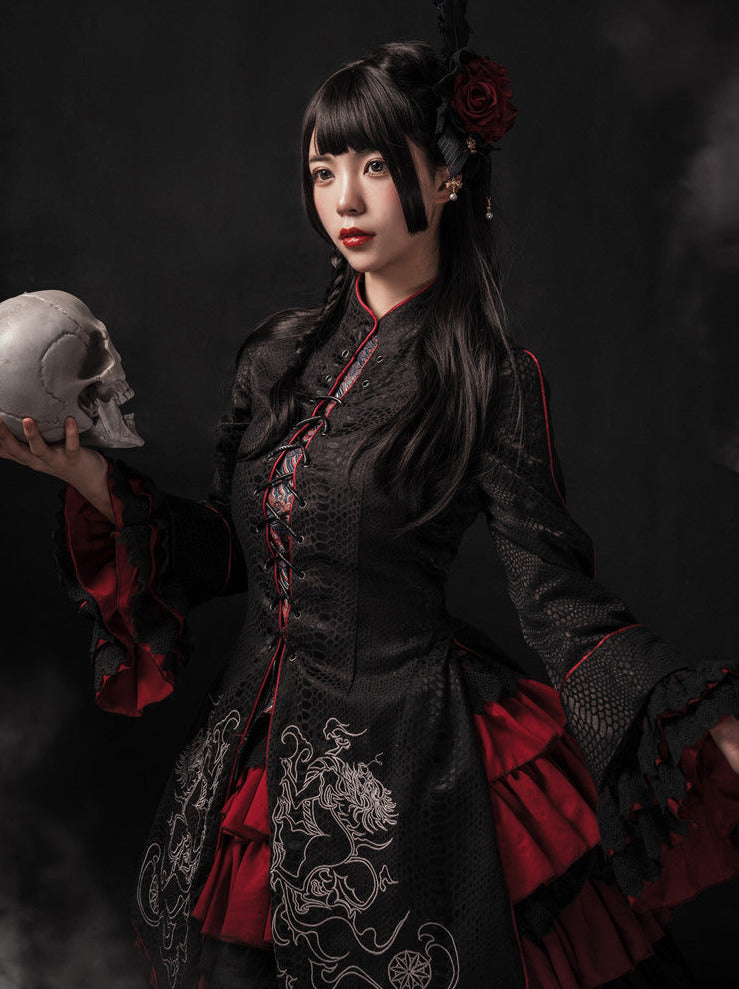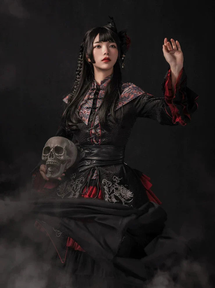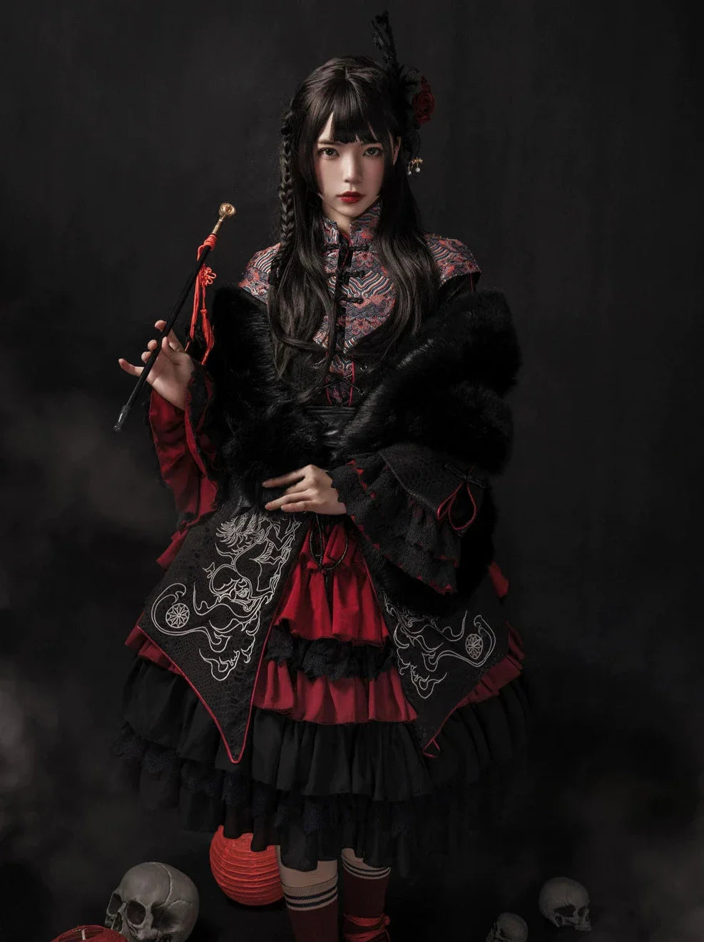 キュートでスタイリッシュな装いをお探しですか?チャイナロリィータゴゴシックケープセットはもう探す必要はありません!ロングジャケット、キャミソール、スカート、ウエストバンドがセットになったこのセットは、どんなスタイルにもキュートさをプラスしてくれます。コスプレ、ハロウィン、普段使いにもぴったりです。