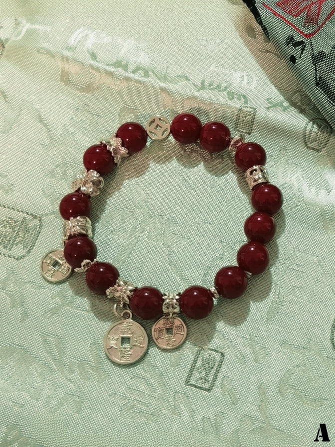 シノワズリ銅貨チャームレッドビーズブレスレット