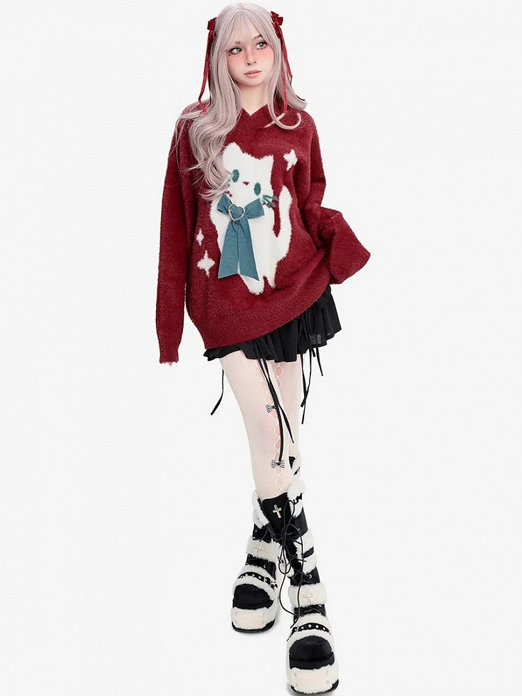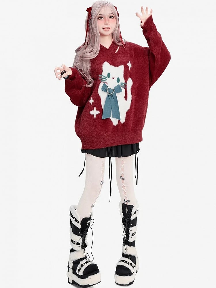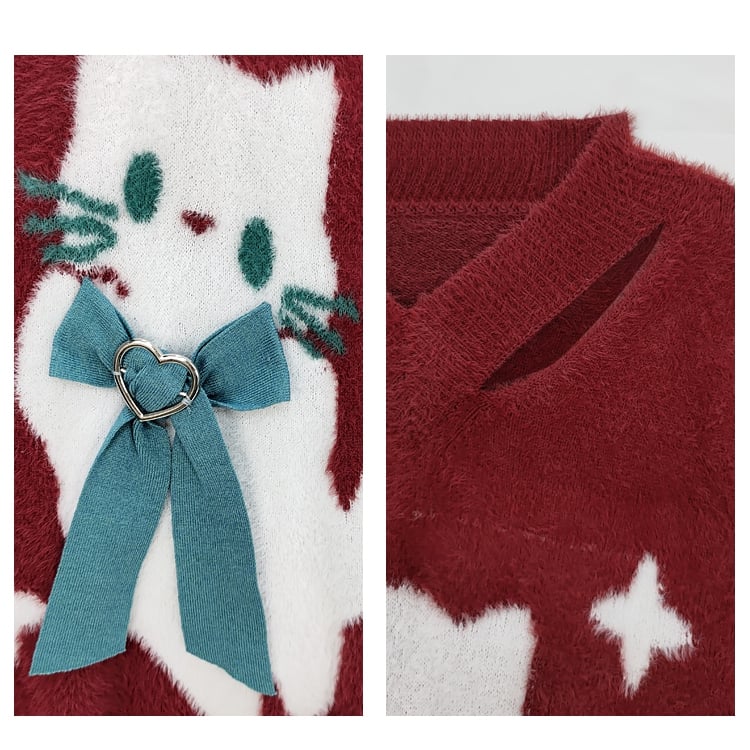 クリスマスらしい華やかなレッドカラーと、キュートな猫の蝶結びデザインが特徴の、愛らしいセーターです。柔らかな素材とVネックで、ホリデーシーズンの着心地とスタイリッシュさを両立。このセーターで猫への愛を表現し、ホリデーシーズンの喜びを広めましょう!