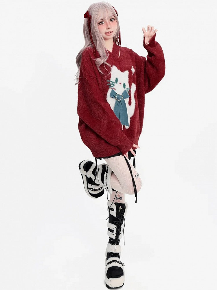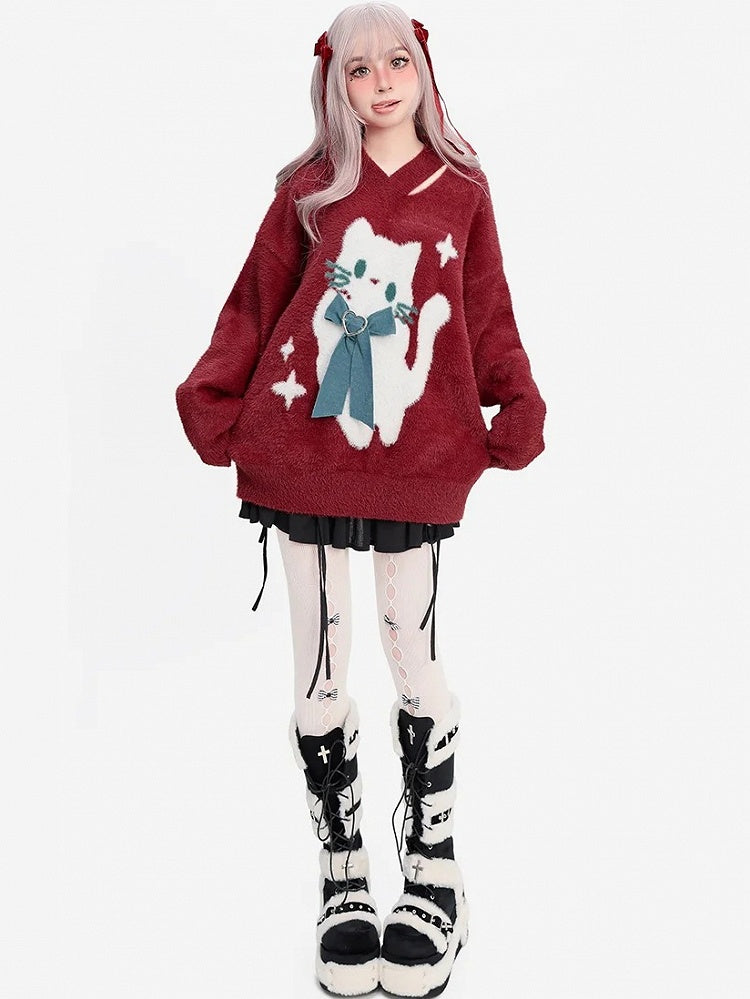 クリスマスレッドキャットリボンVネックソフトセーター