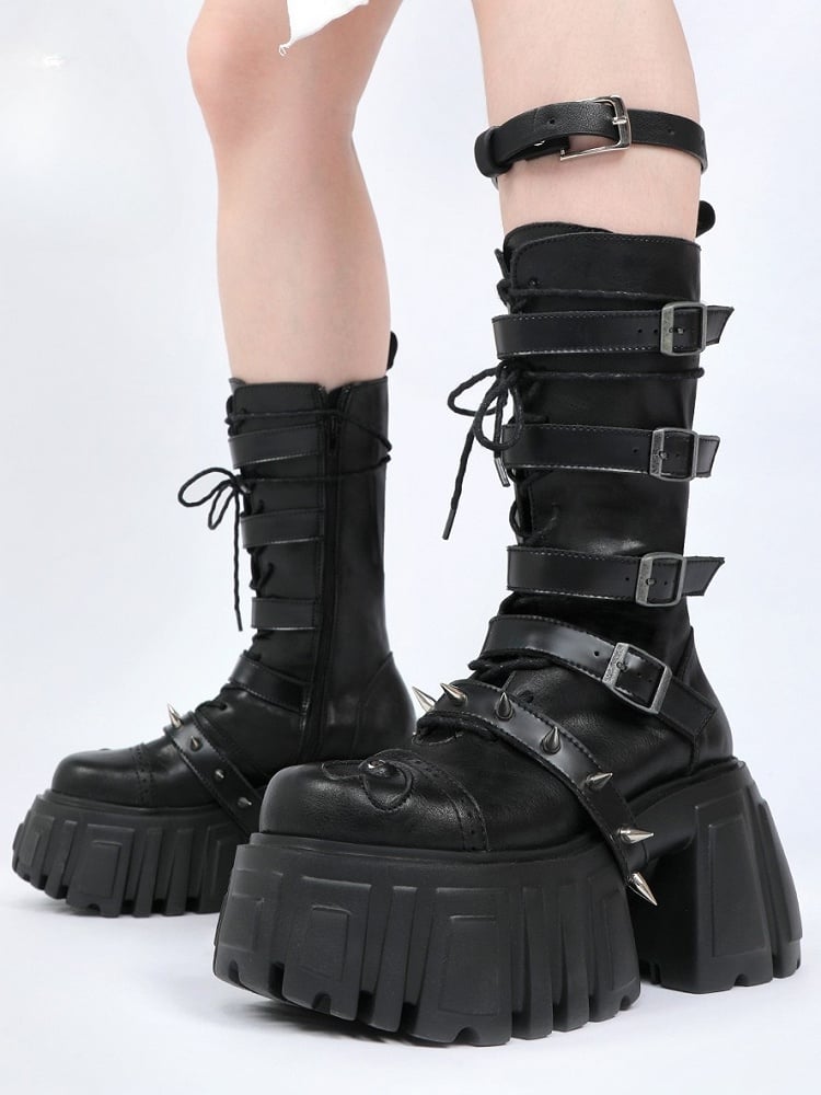 Chunky Platforms Accents Boots Studs Toe Black Cyberpunk with Straps - Mid-Calf Eye-Embellished Buckle