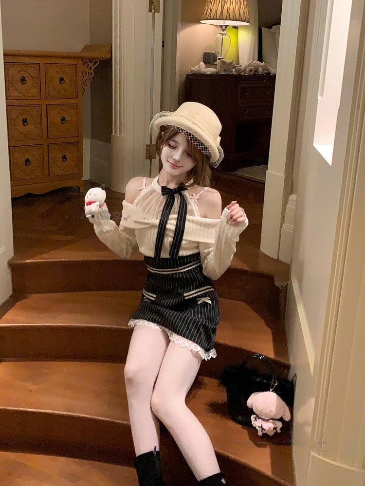 Clean Kei Dress in Halter White Innocent Jirai Stripes Black