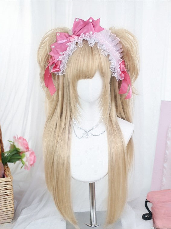 ブロンド 65-70cm 長さストレートウィッグ(フルバングス付き)+ 35cm ダブルカーリーポニーテールクロークリップ
