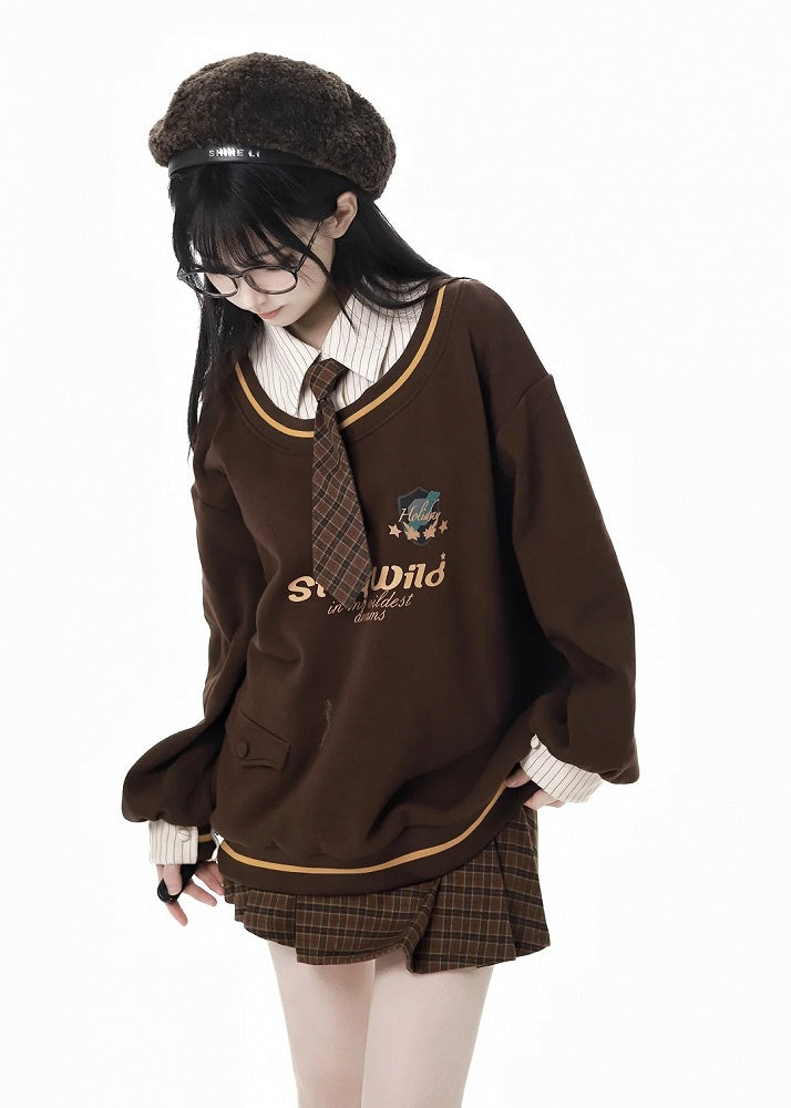 コーヒー&ホワイトのストライプシャツカラーのフェイクツーピーススウェットシャツ(ネクタイ付き)