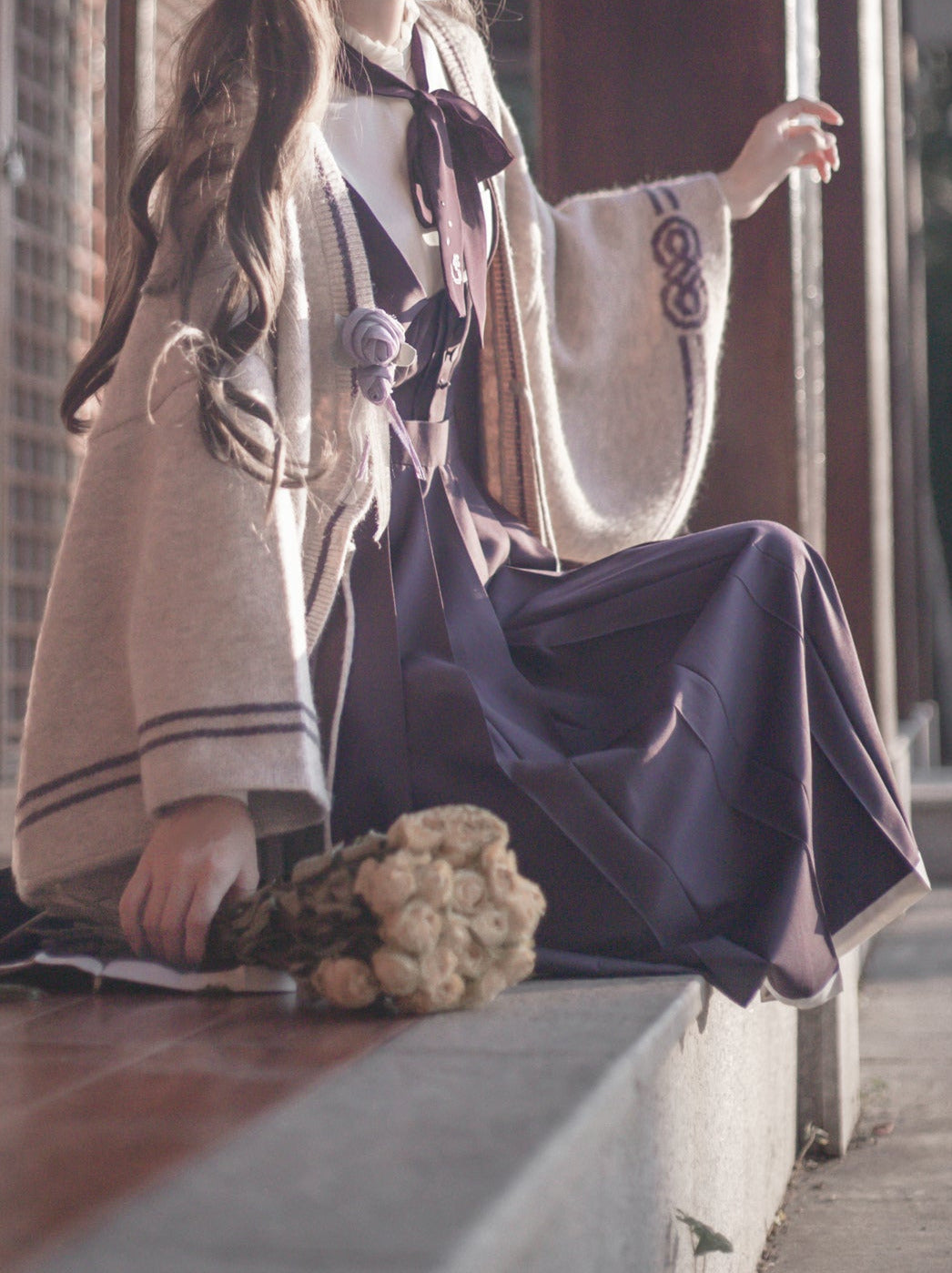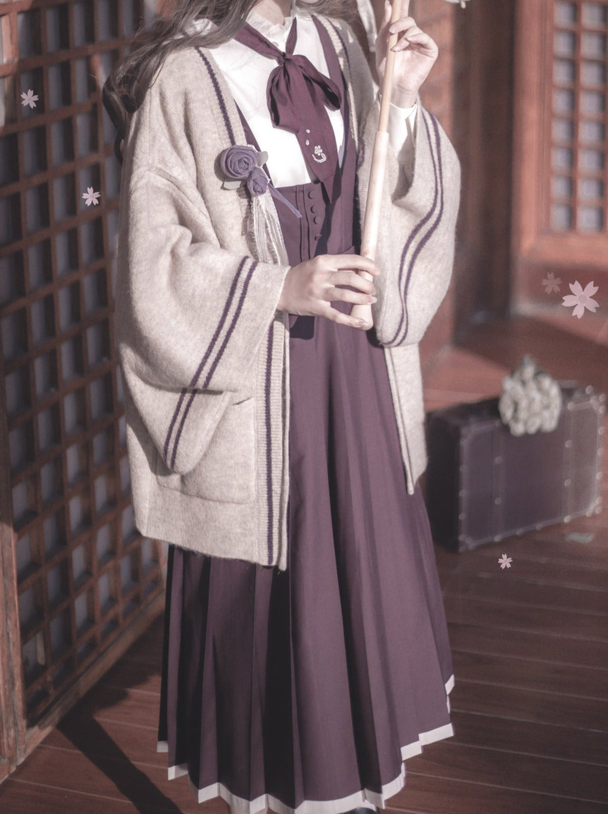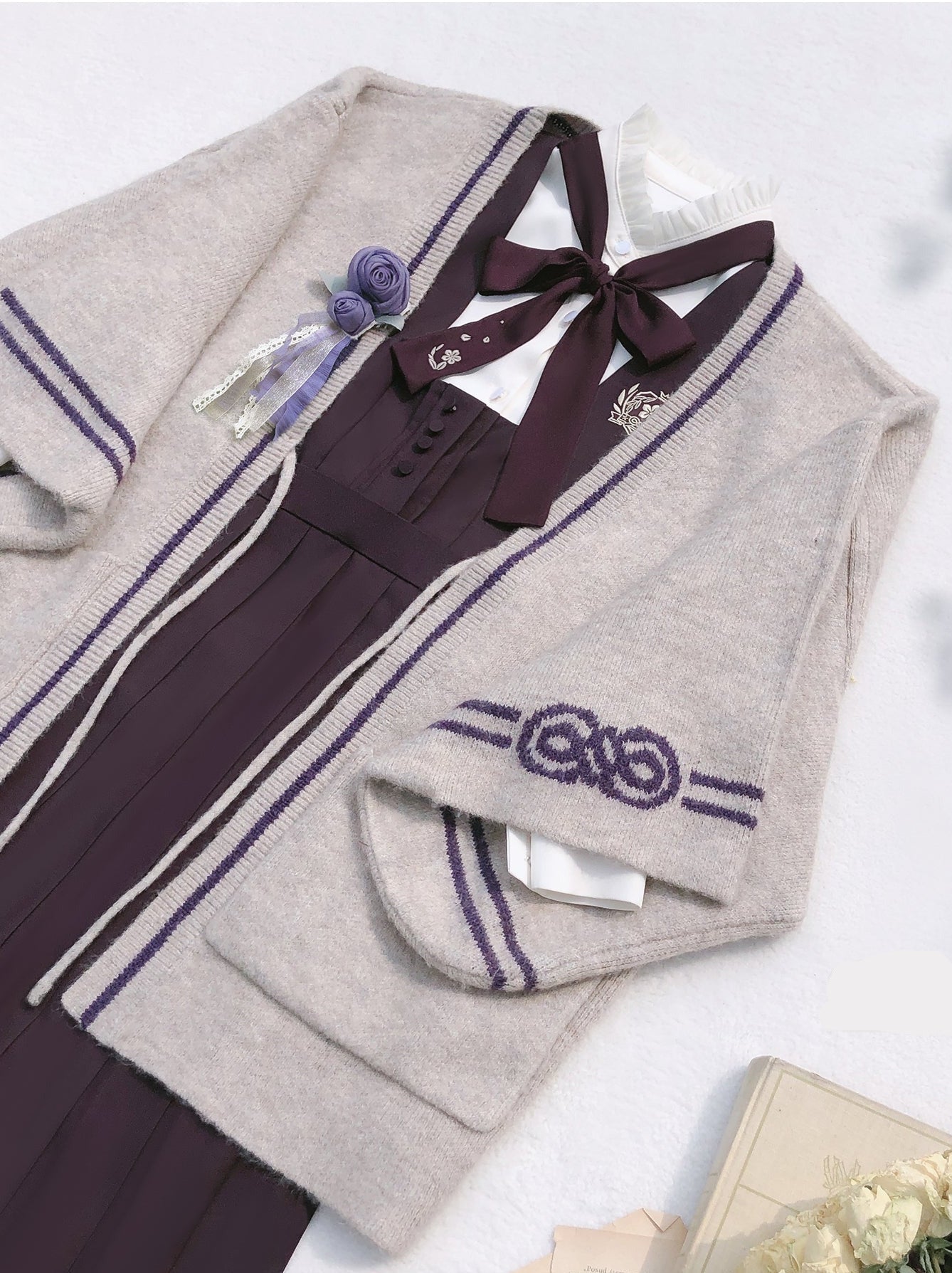 襟付きコサージュドレス レトロシャツベストカーディガン スタンドニット フリルスリーブ + 日本製リボン