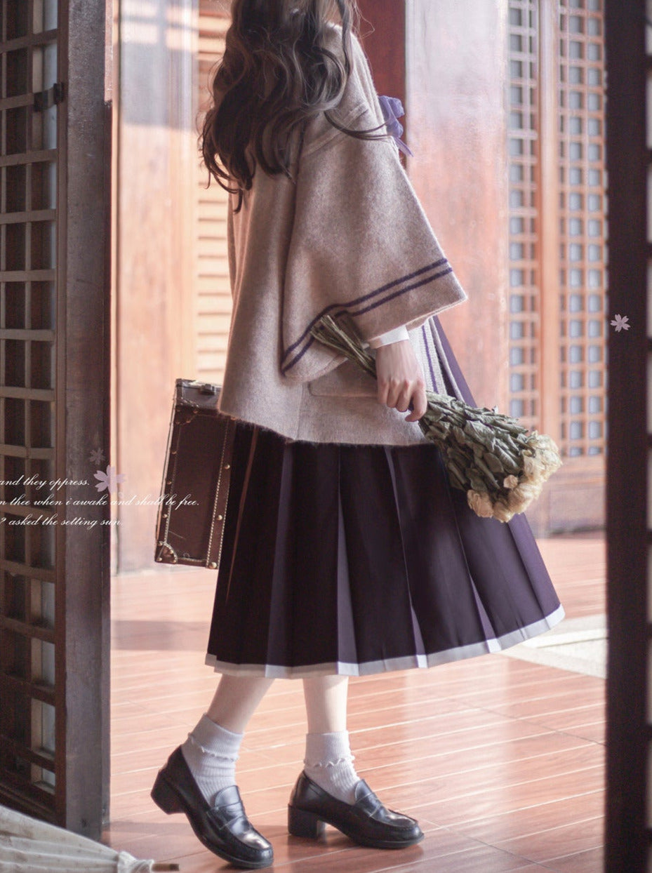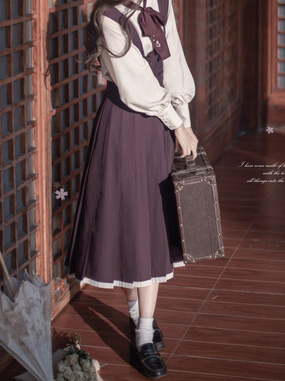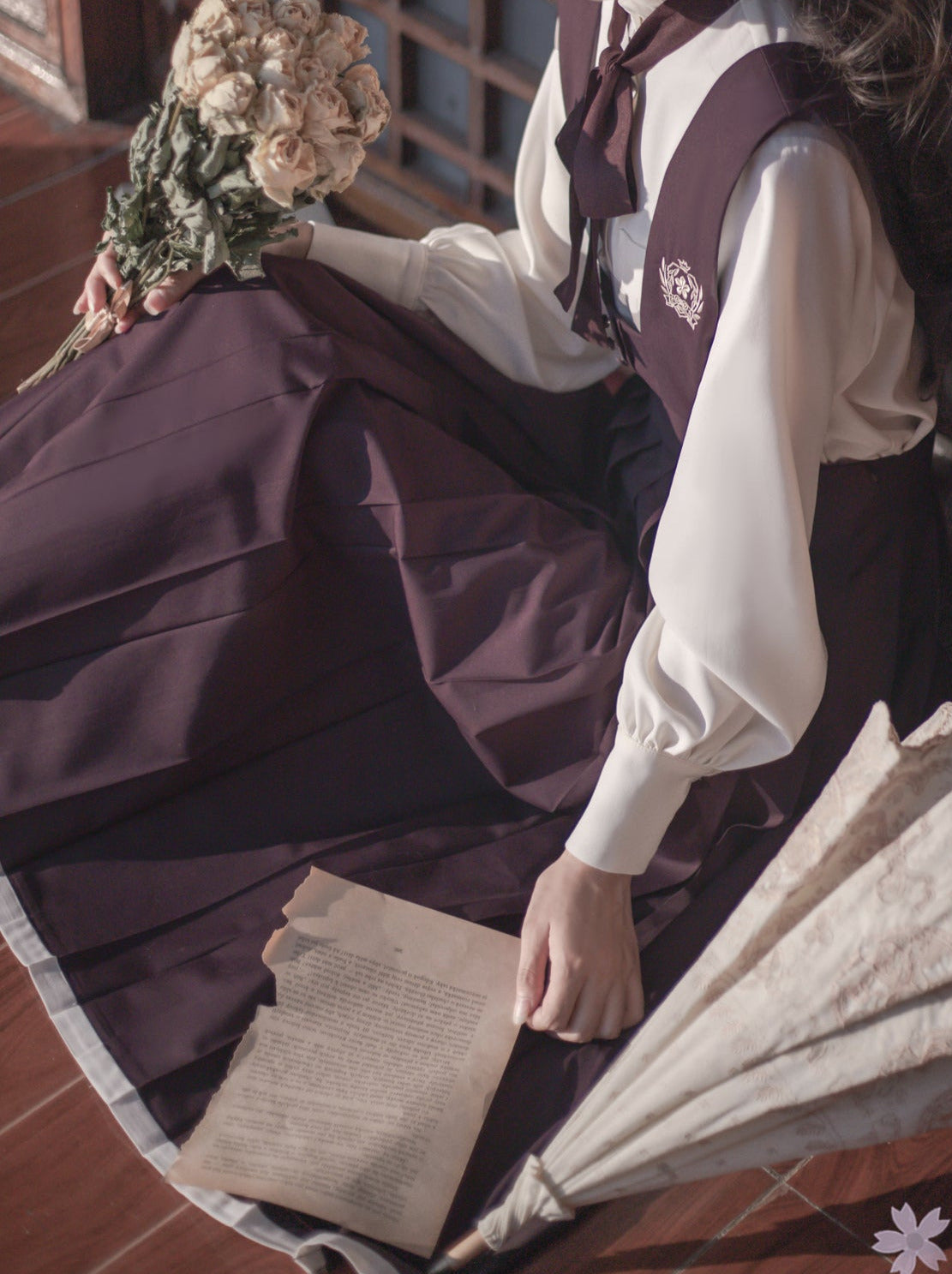 襟付きコサージュドレス レトロシャツベストカーディガン スタンドニット フリルスリーブ + 日本製リボン