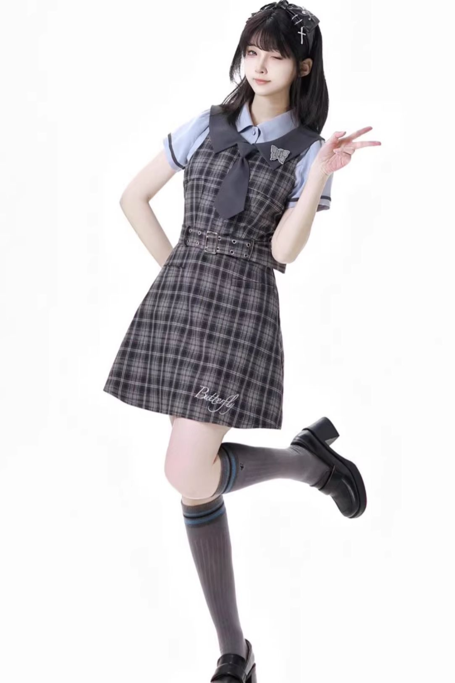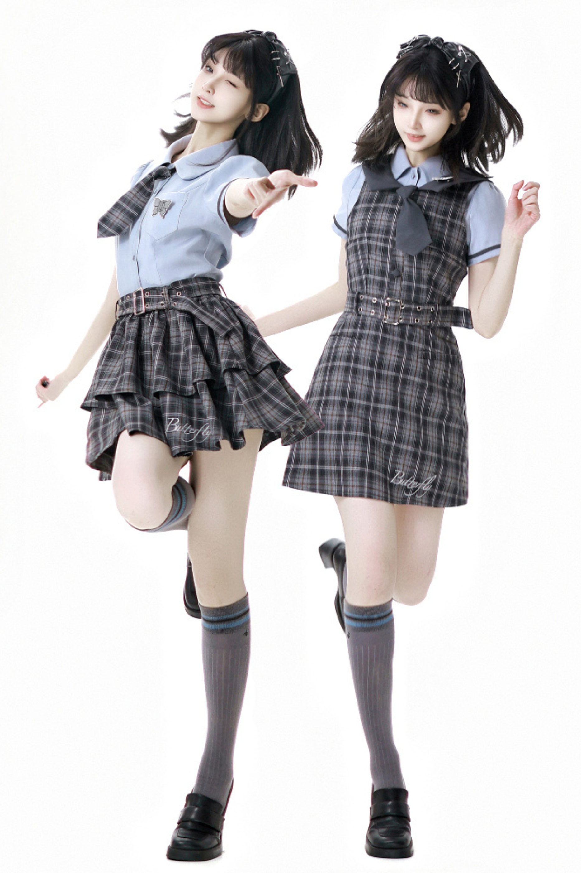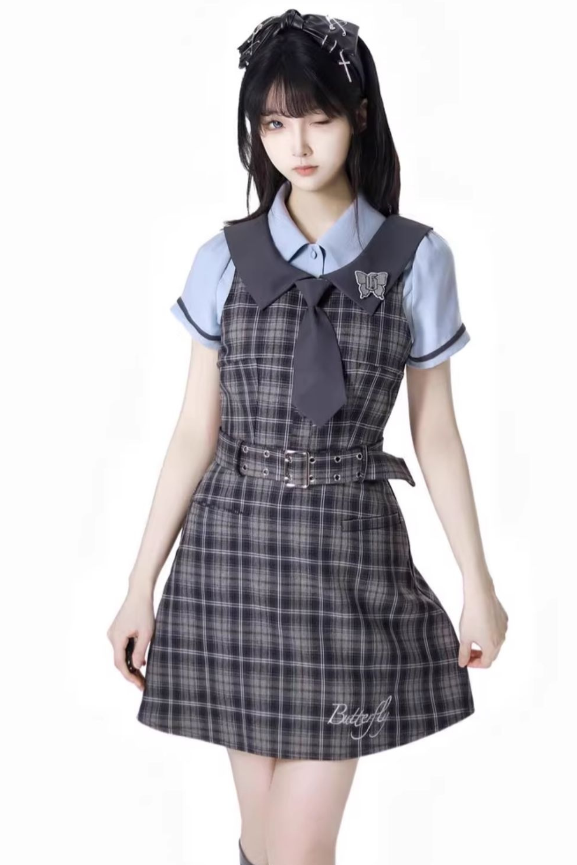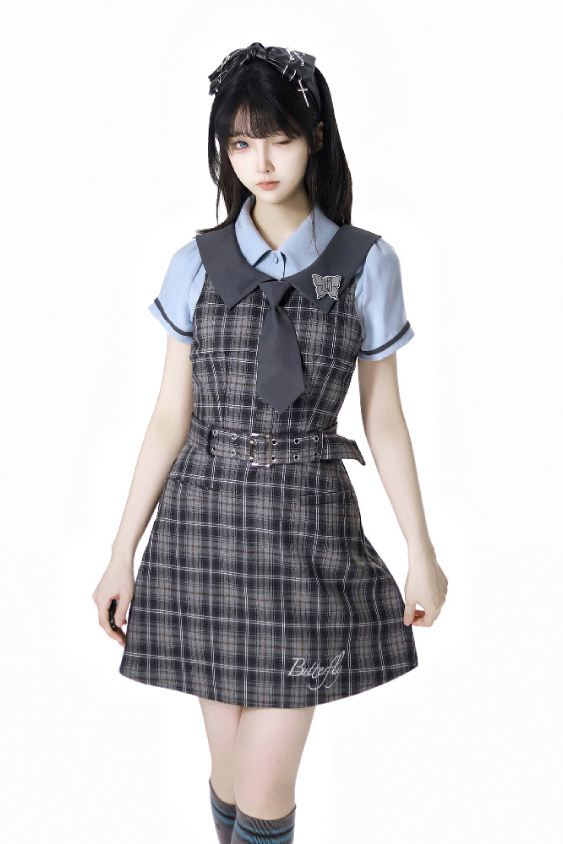 ❤勇気ブークレシャツ + サスペンダードレス + ショートスカート❤