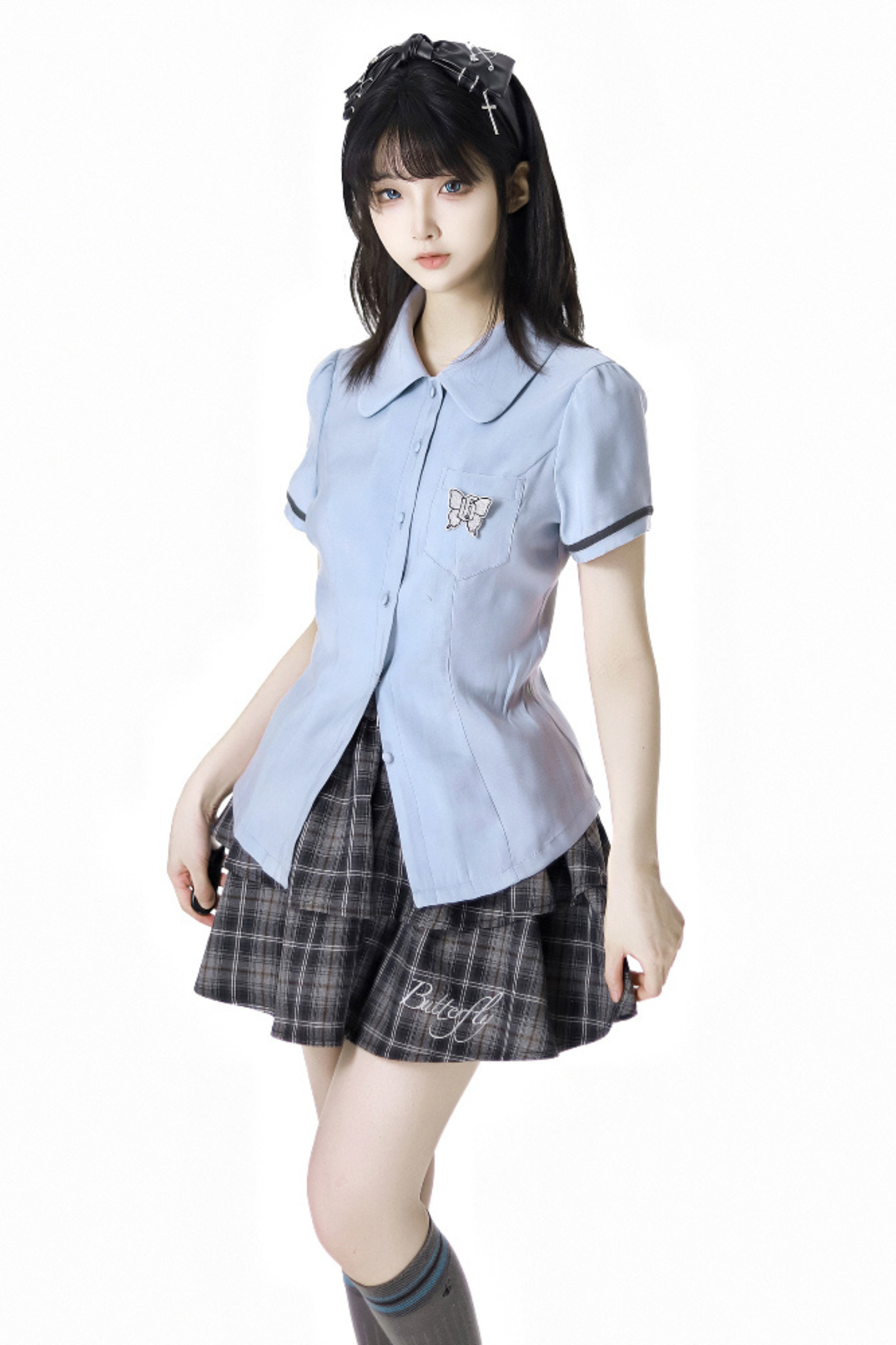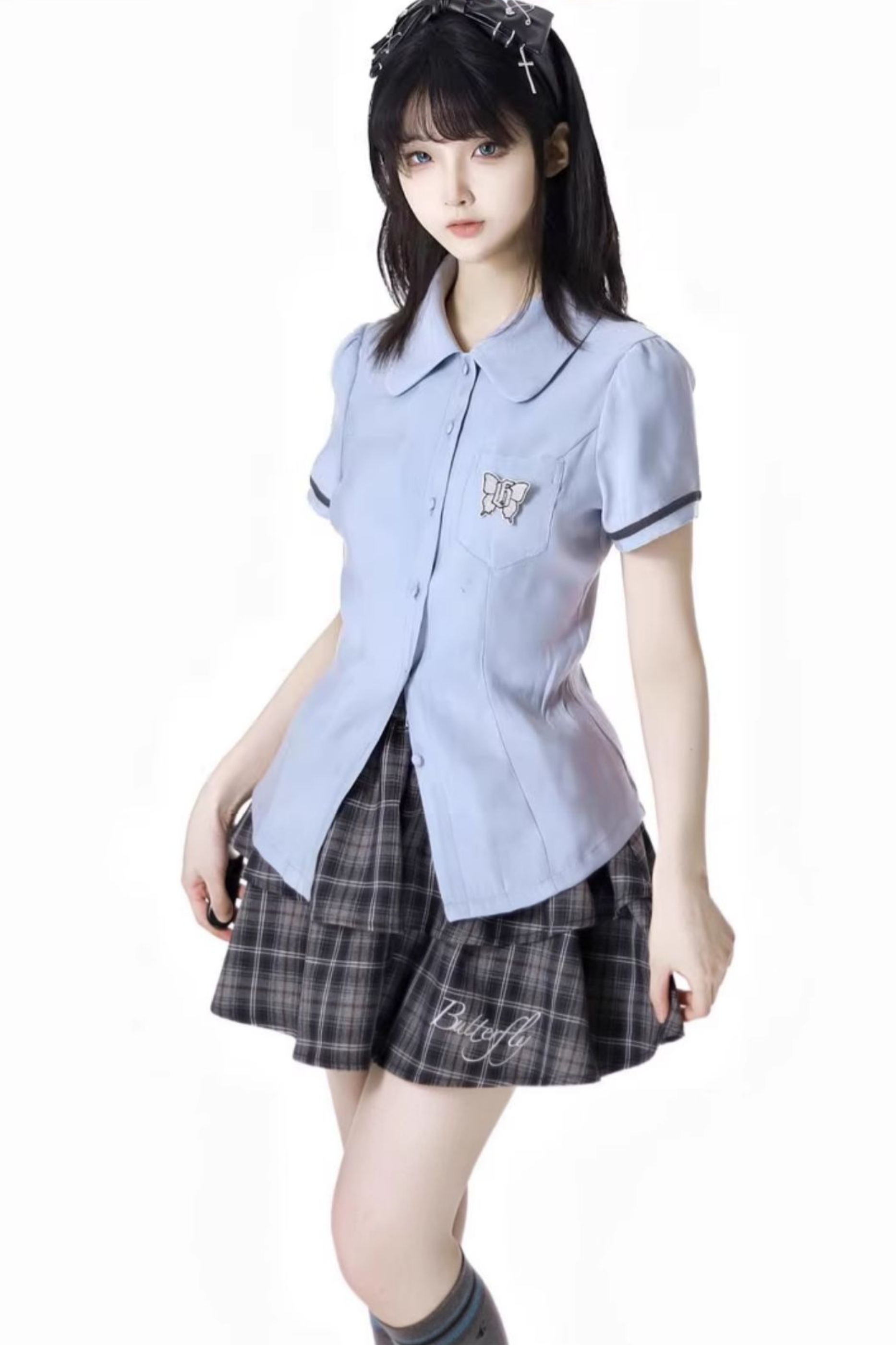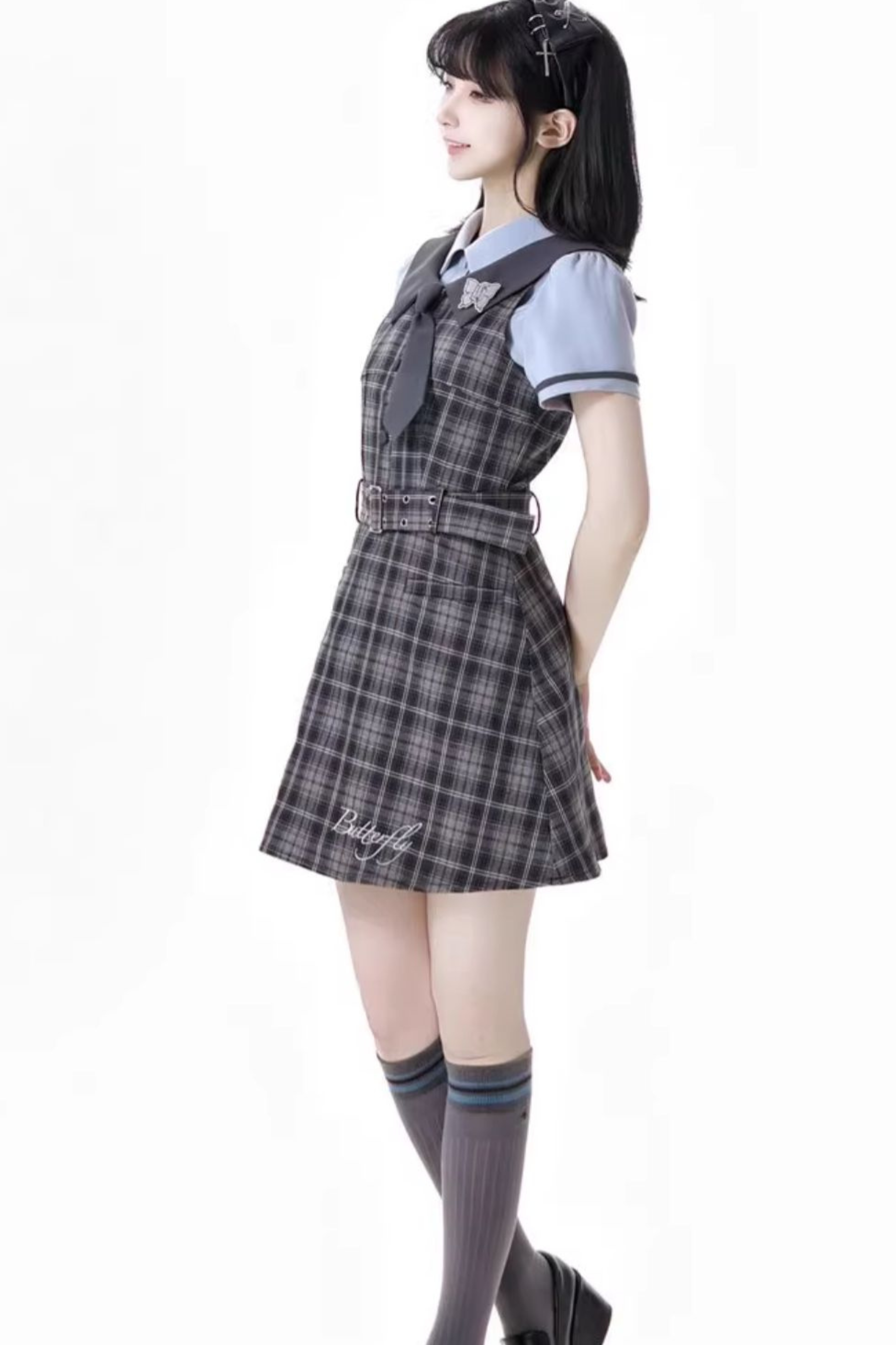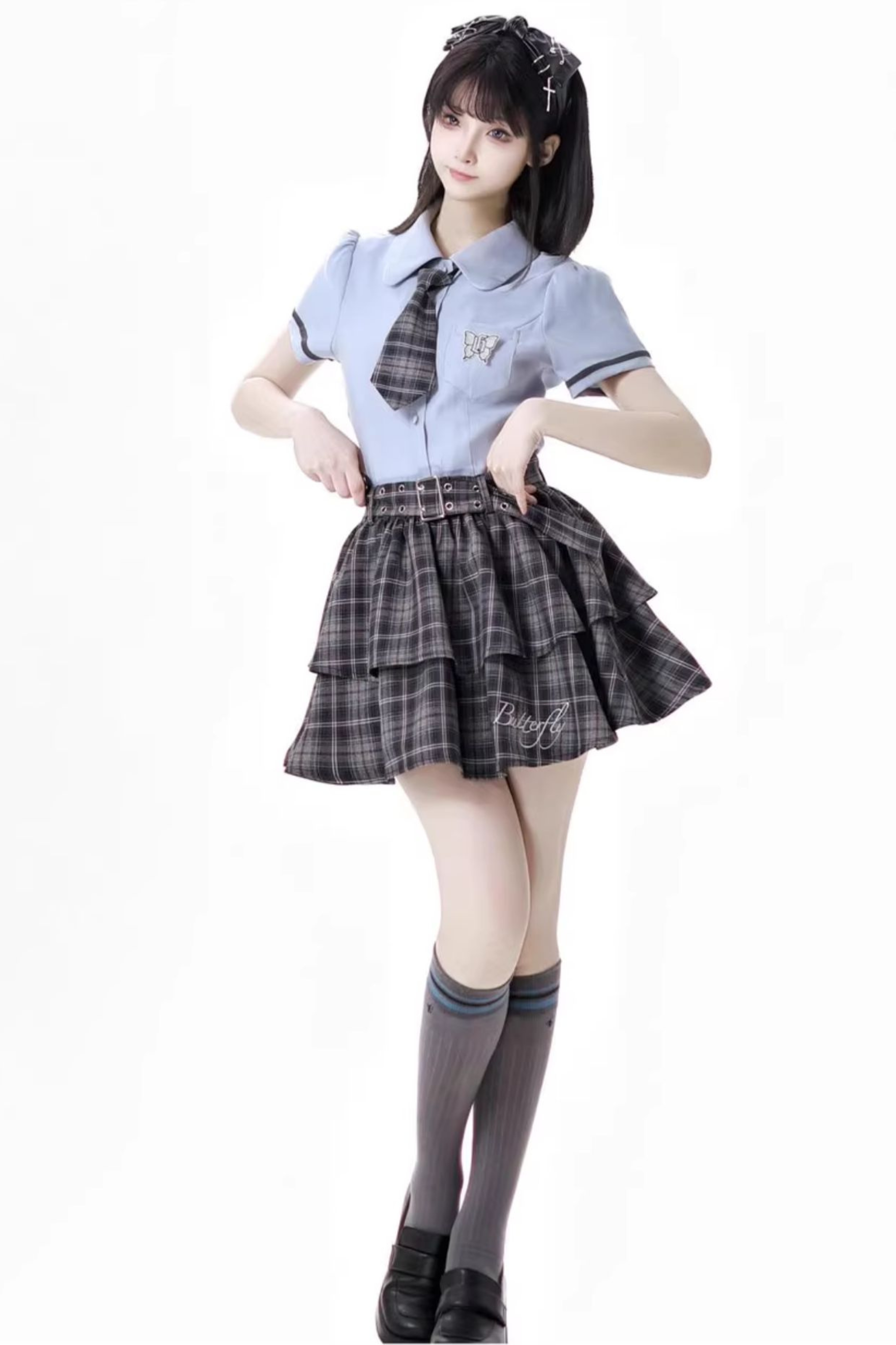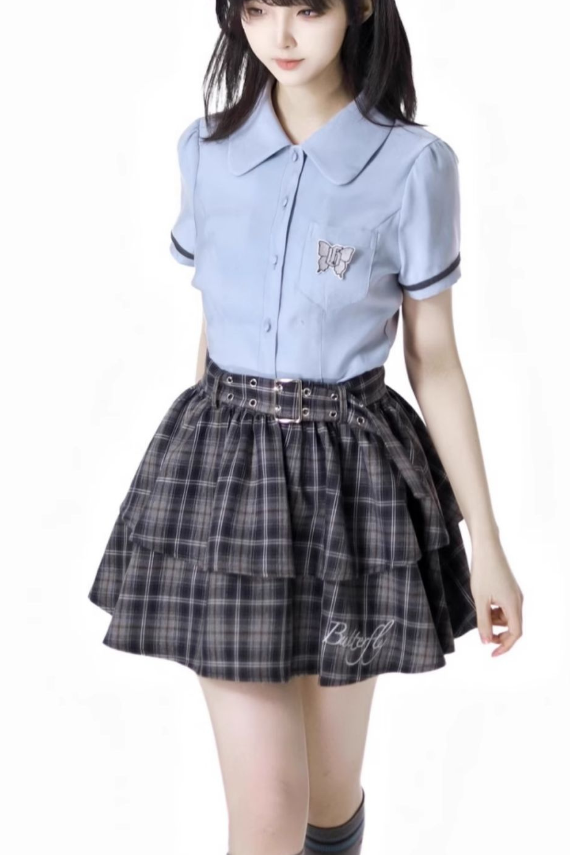 ❤勇気ブークレシャツ + サスペンダードレス + ショートスカート❤