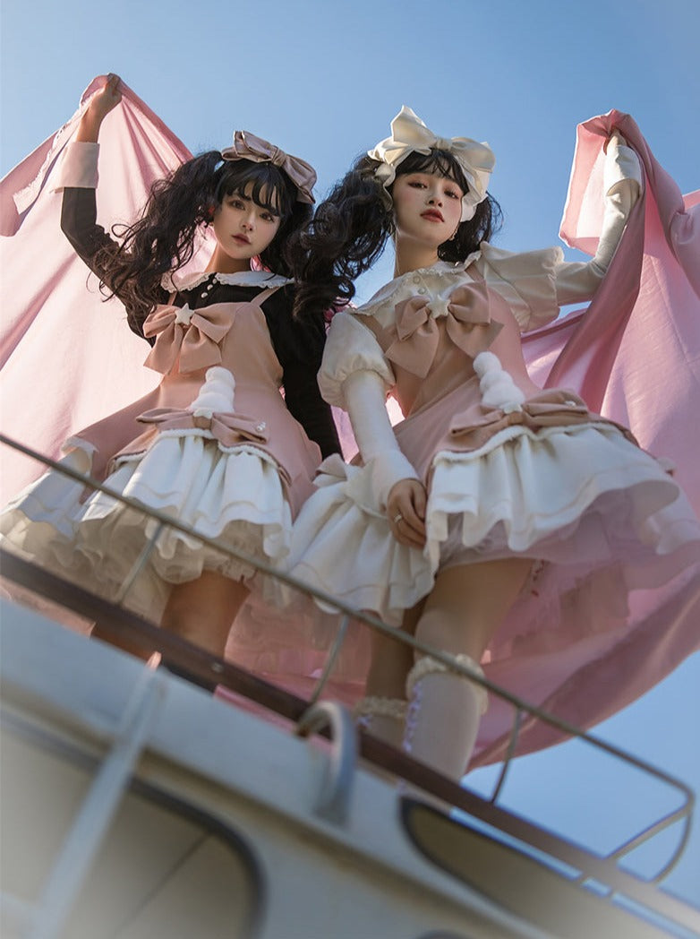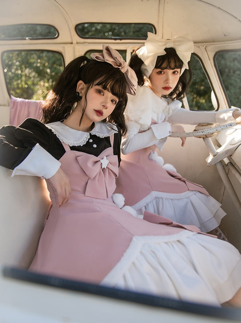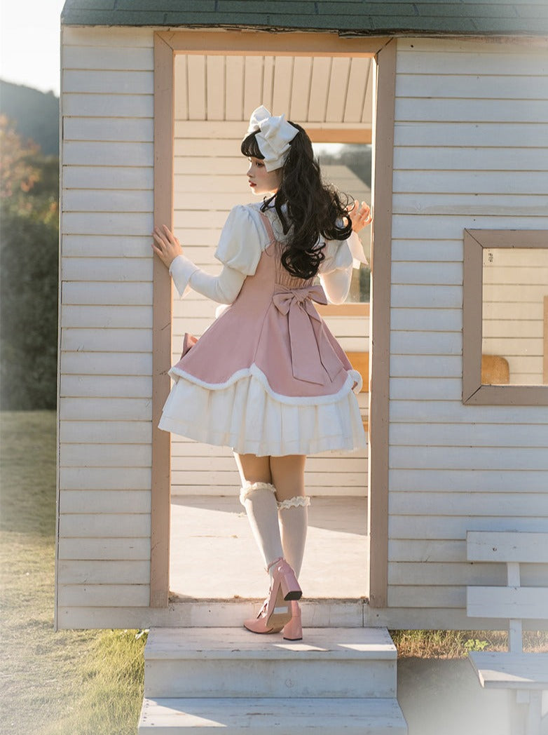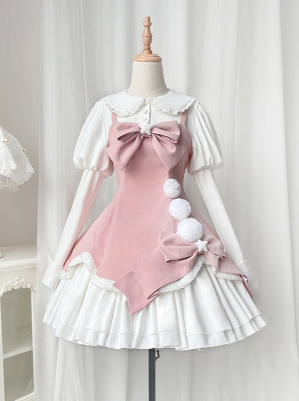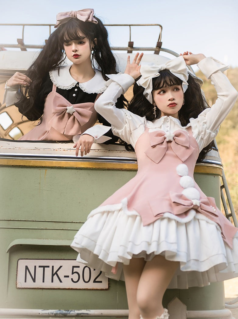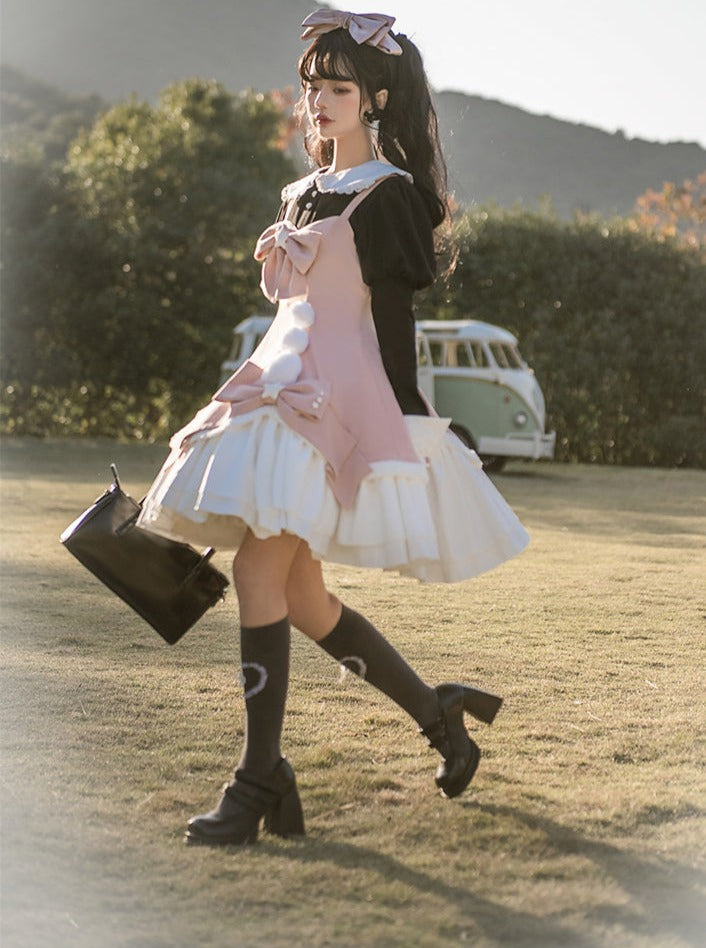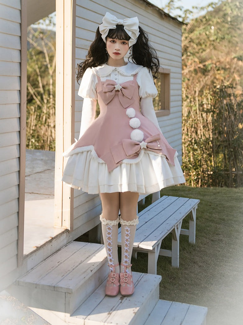 ピンクと白のオールドスクールロリータファッションドレス、蝶結びディテール、ロリータJSKセット