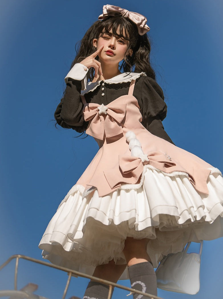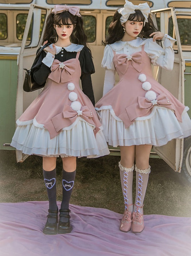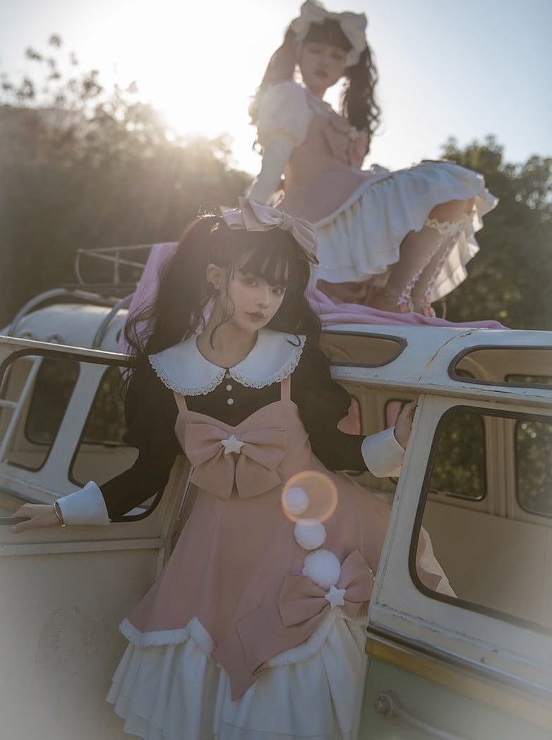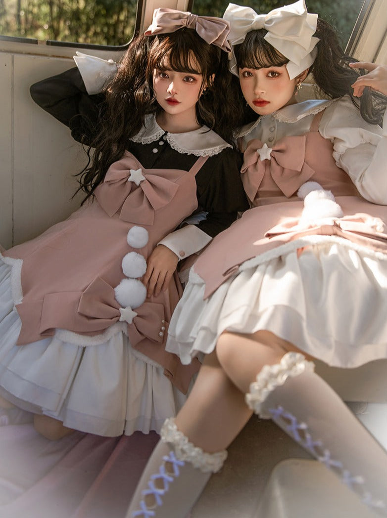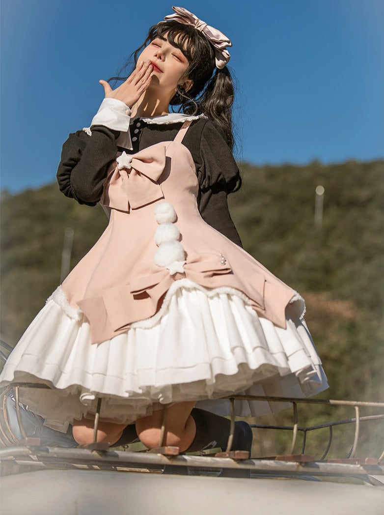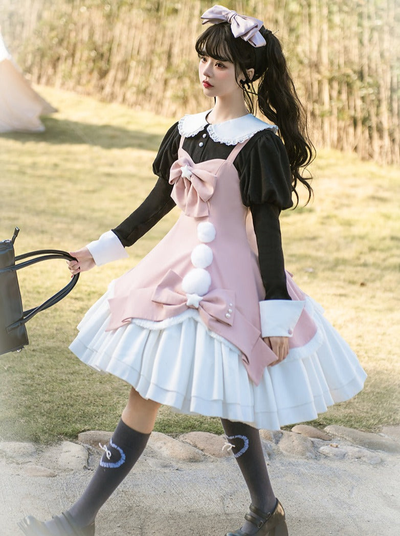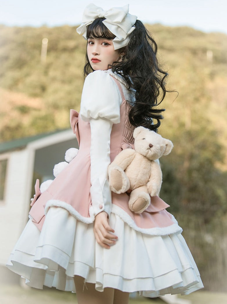 ピンクと白のオールドスクールロリータファッションドレス、蝶結びディテール、ロリータJSKセット