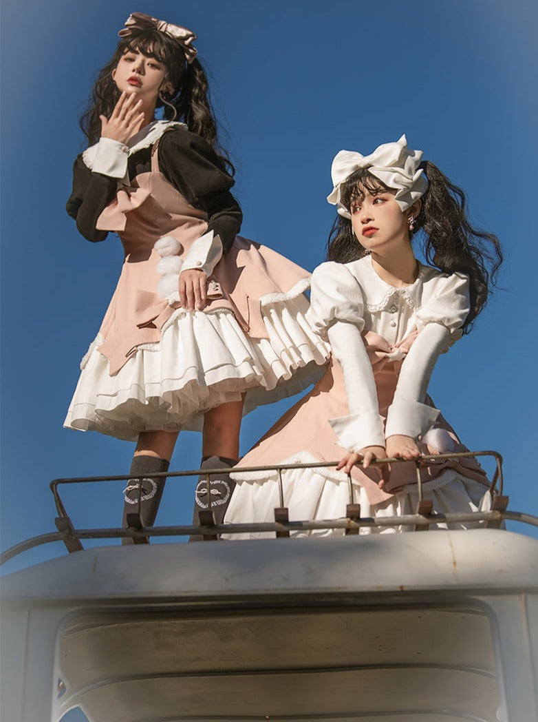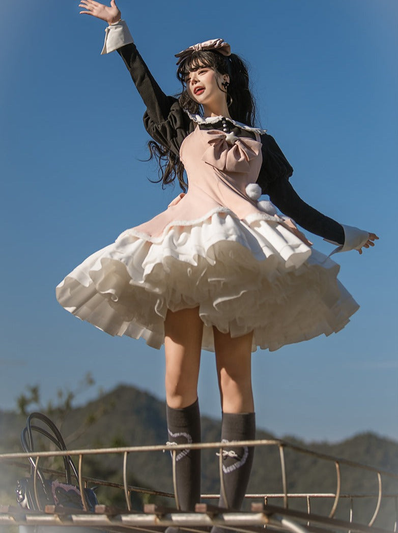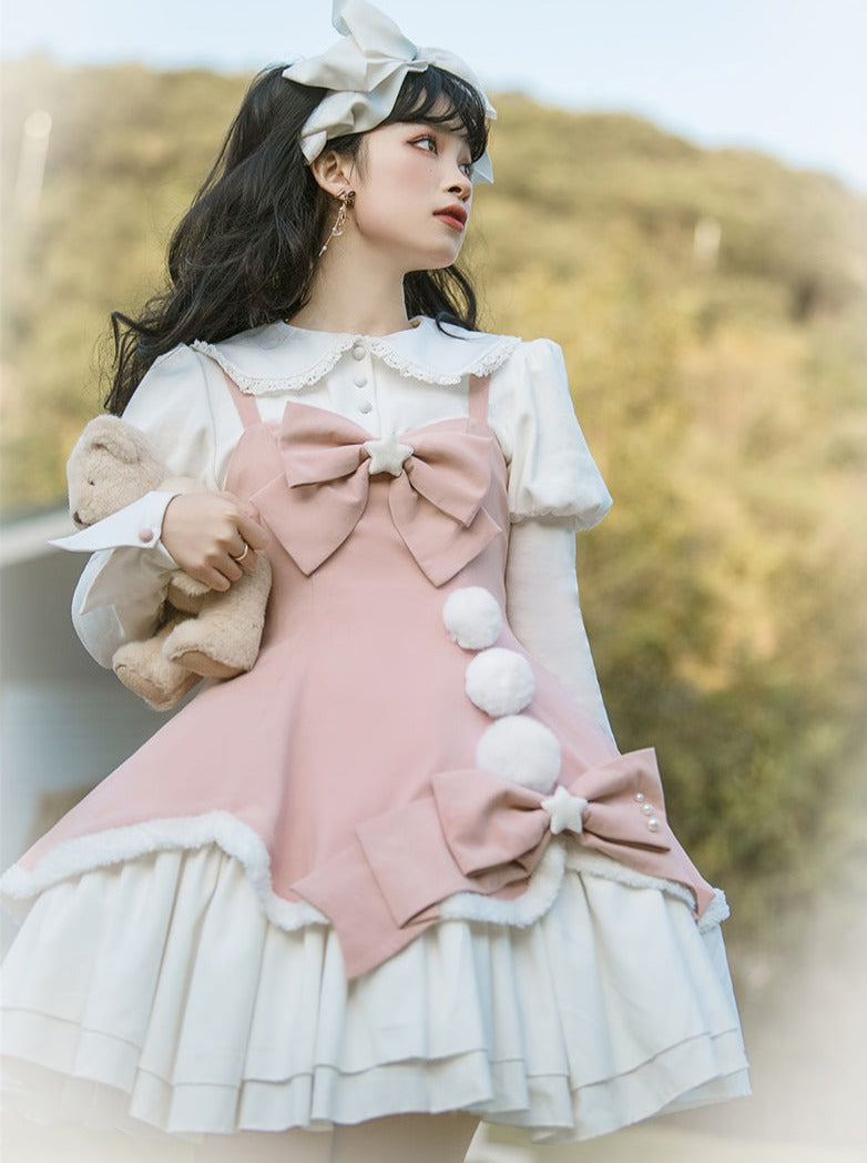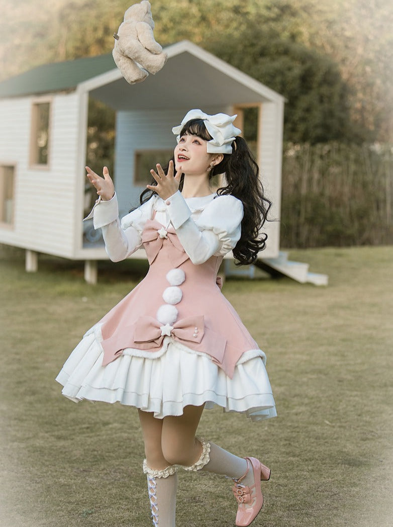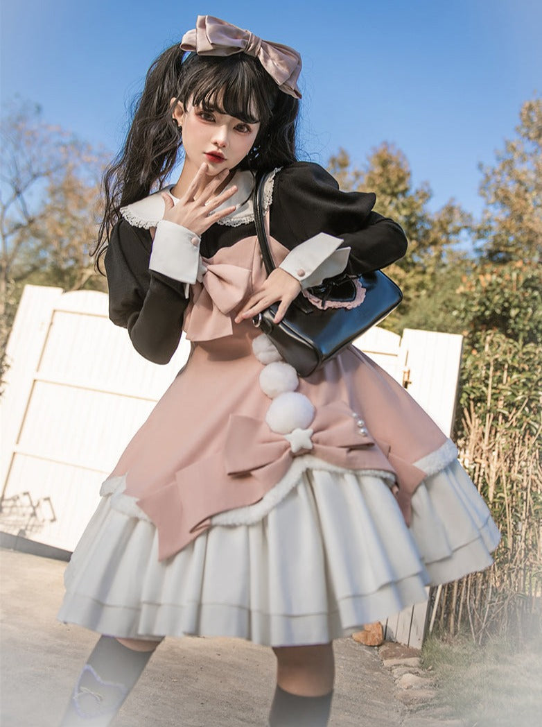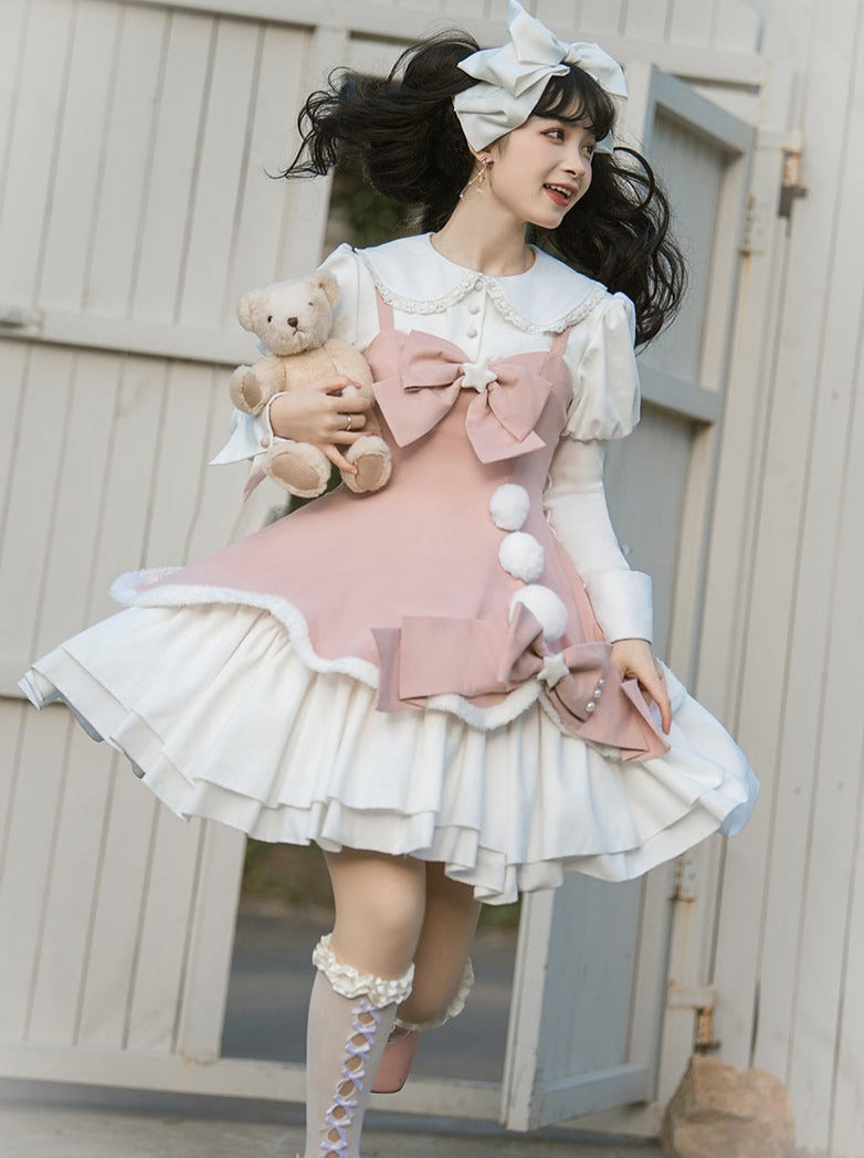 ピンクと白のオールドスクールロリータファッションドレス、蝶結びディテール、ロリータJSKセット