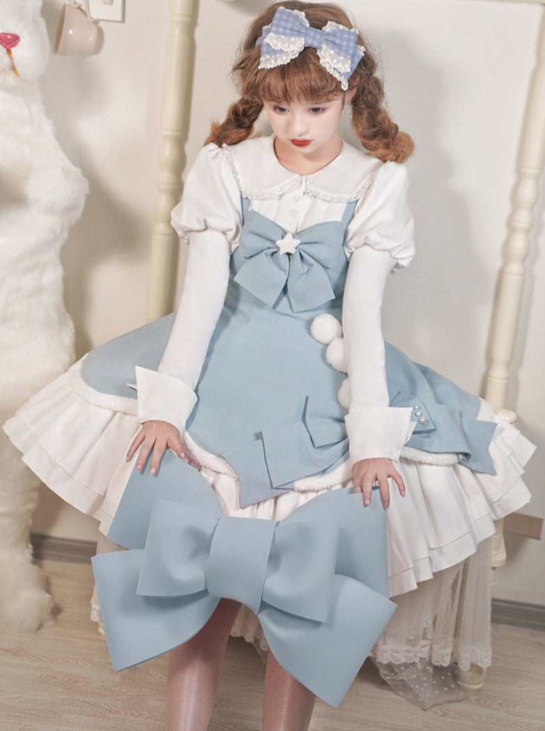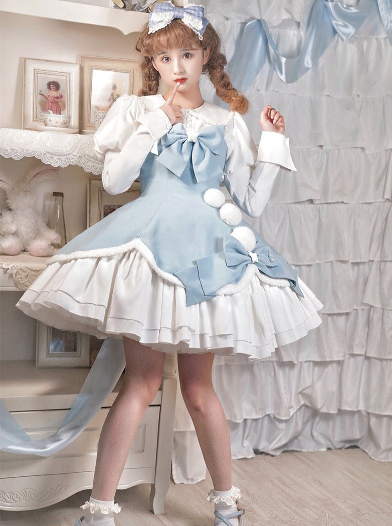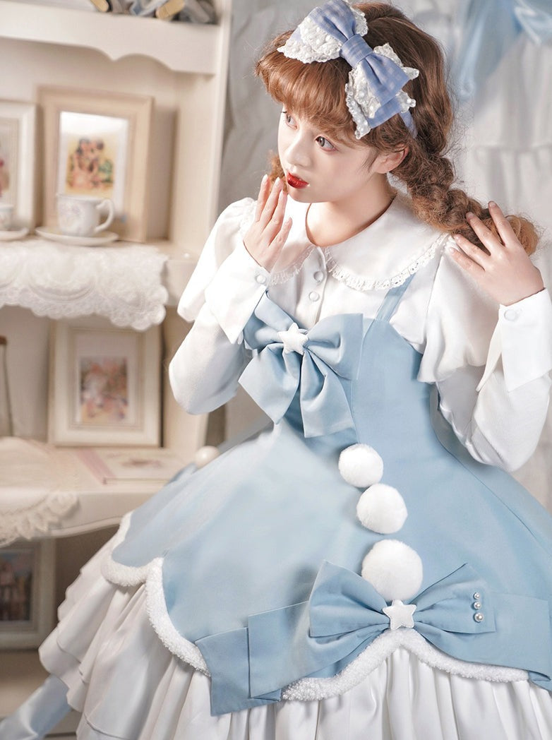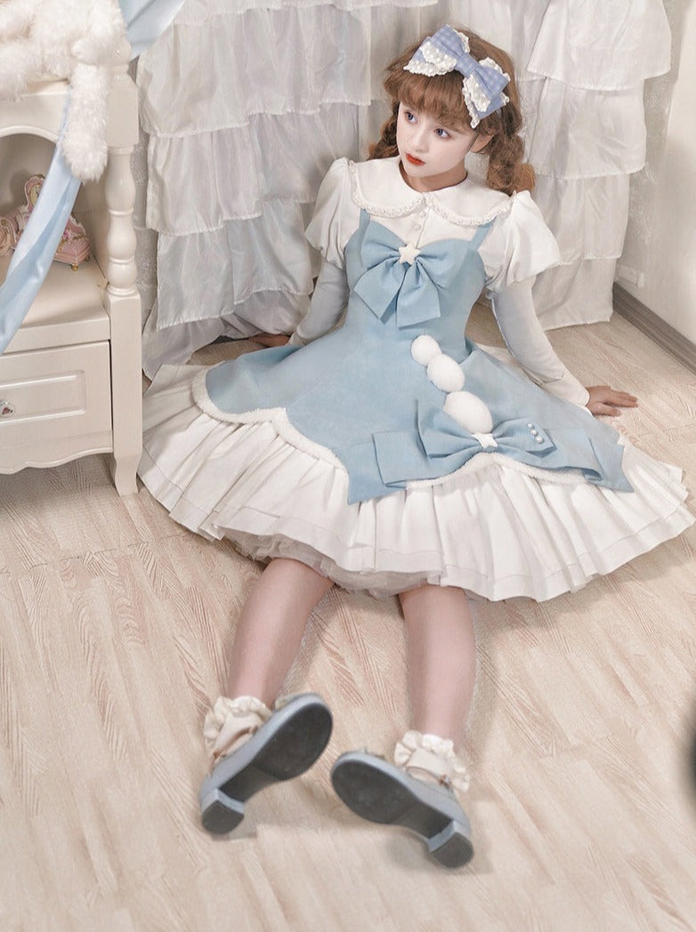 青と白のオールドスクールロリータファッションドレス 蝶結びディテール JSK セット