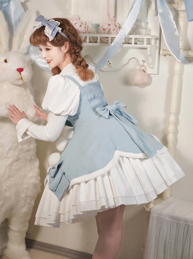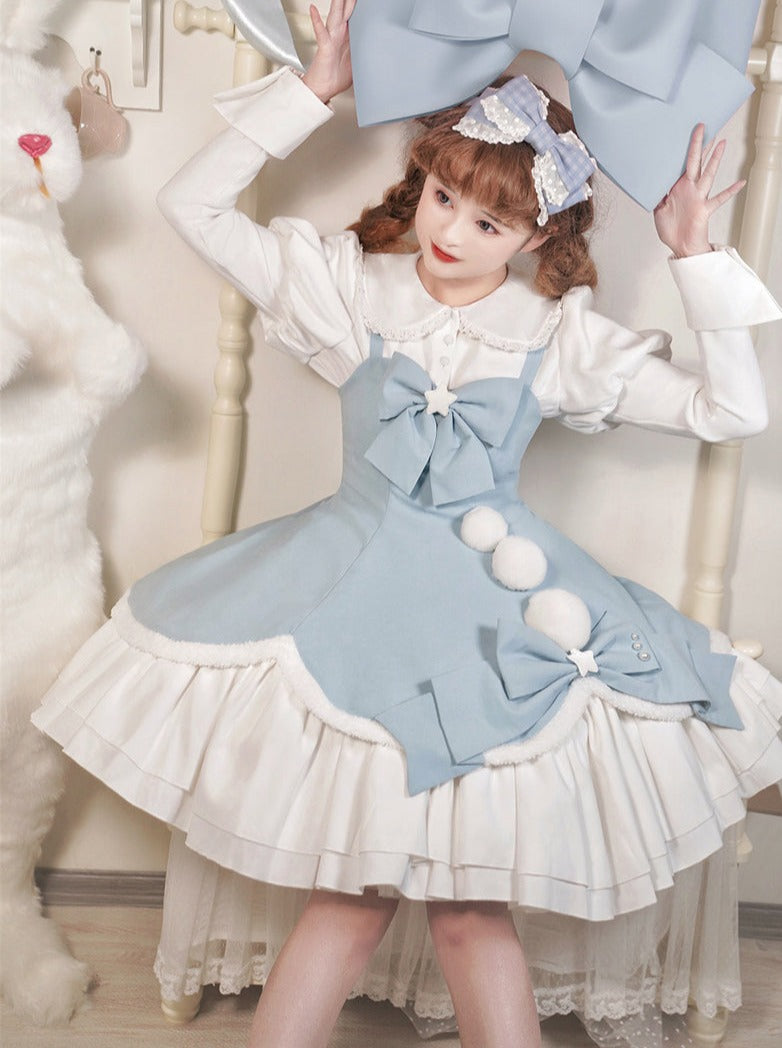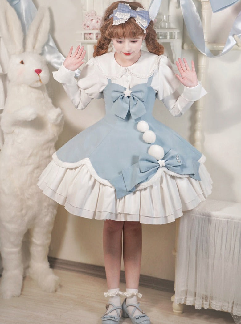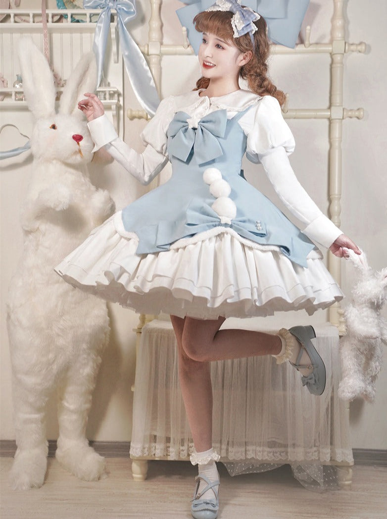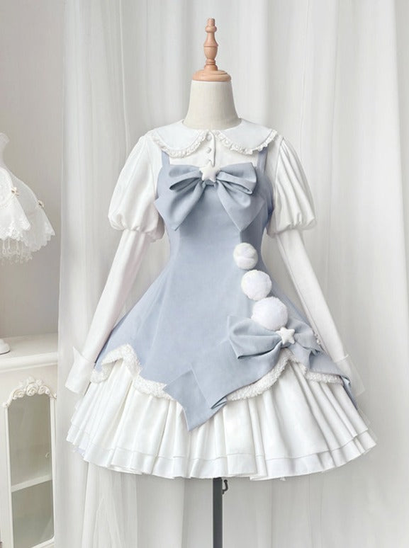 青と白のオールドスクールロリータファッションドレス 蝶結びディテール JSK セット
