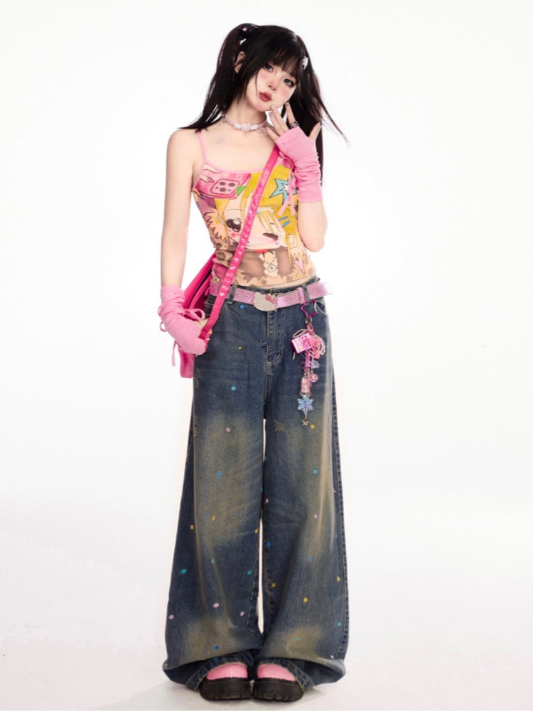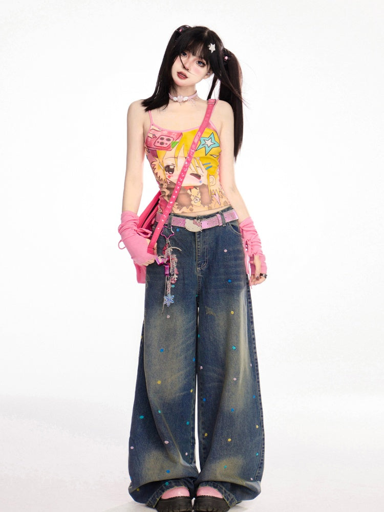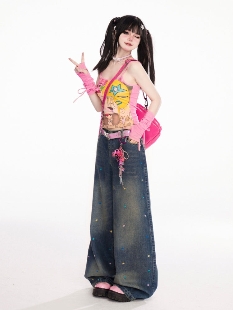 カラフルな水玉模様のダークブルーのダメージ加工ワイドレッグジーンズ