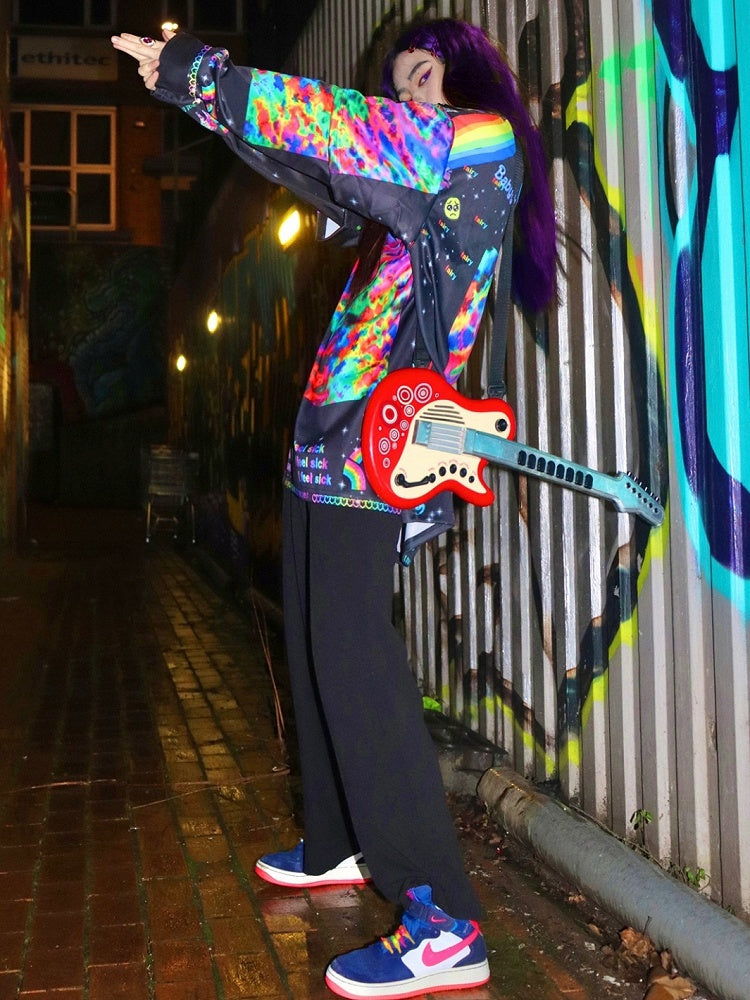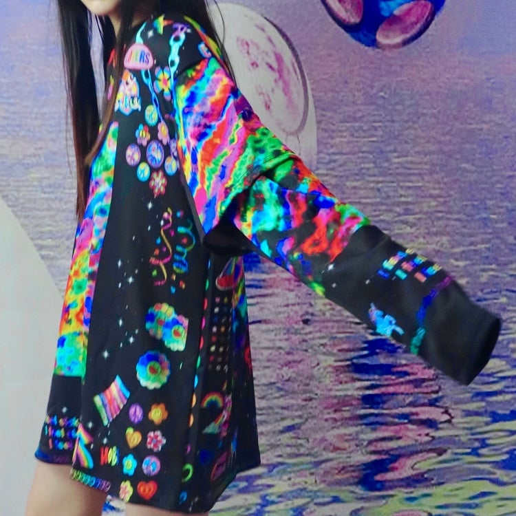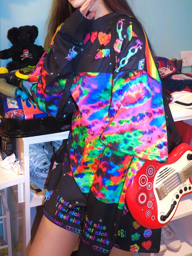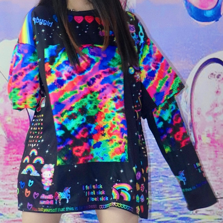 カラフルなスウェットシャツとプリント文字のレインボーハート Y2K