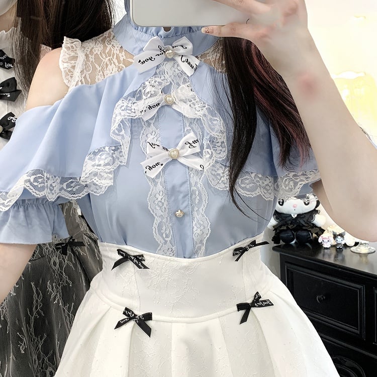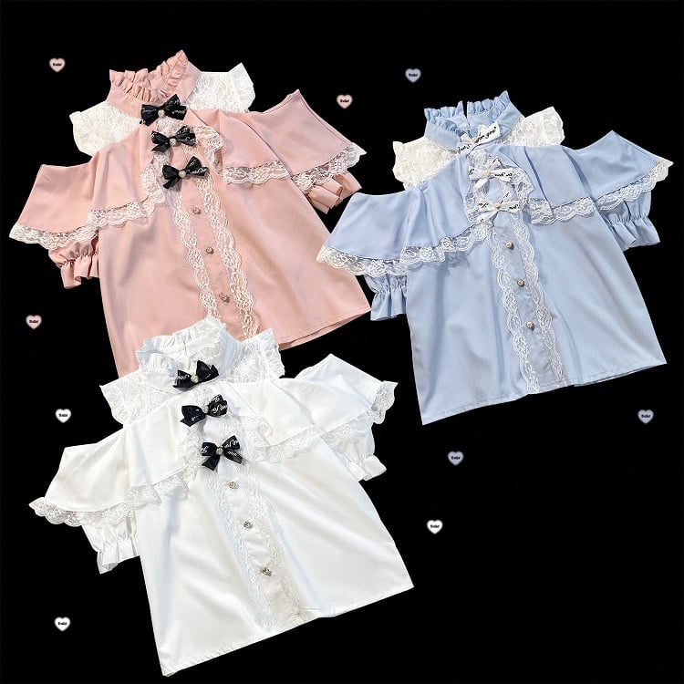 コントラストオープンパッチケイレースブラウスジライホワイト/ピンク/ブルーショルダー