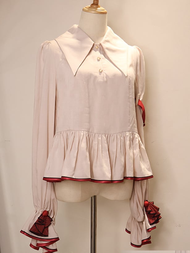 コントラストレッドトリムのフラウンスヘムベージュシャツ
