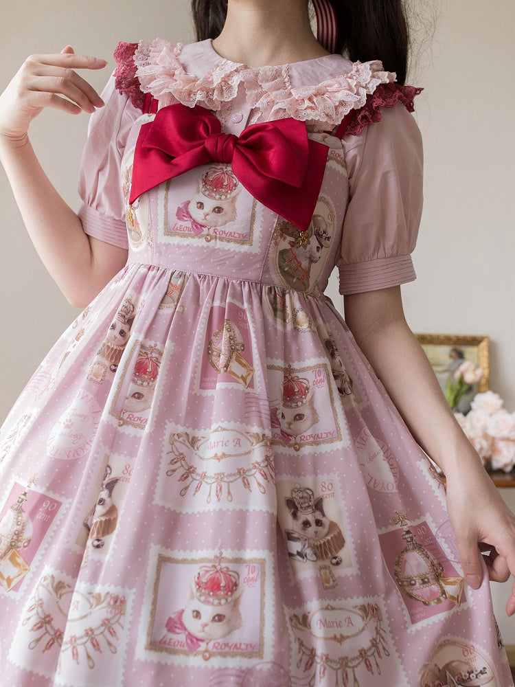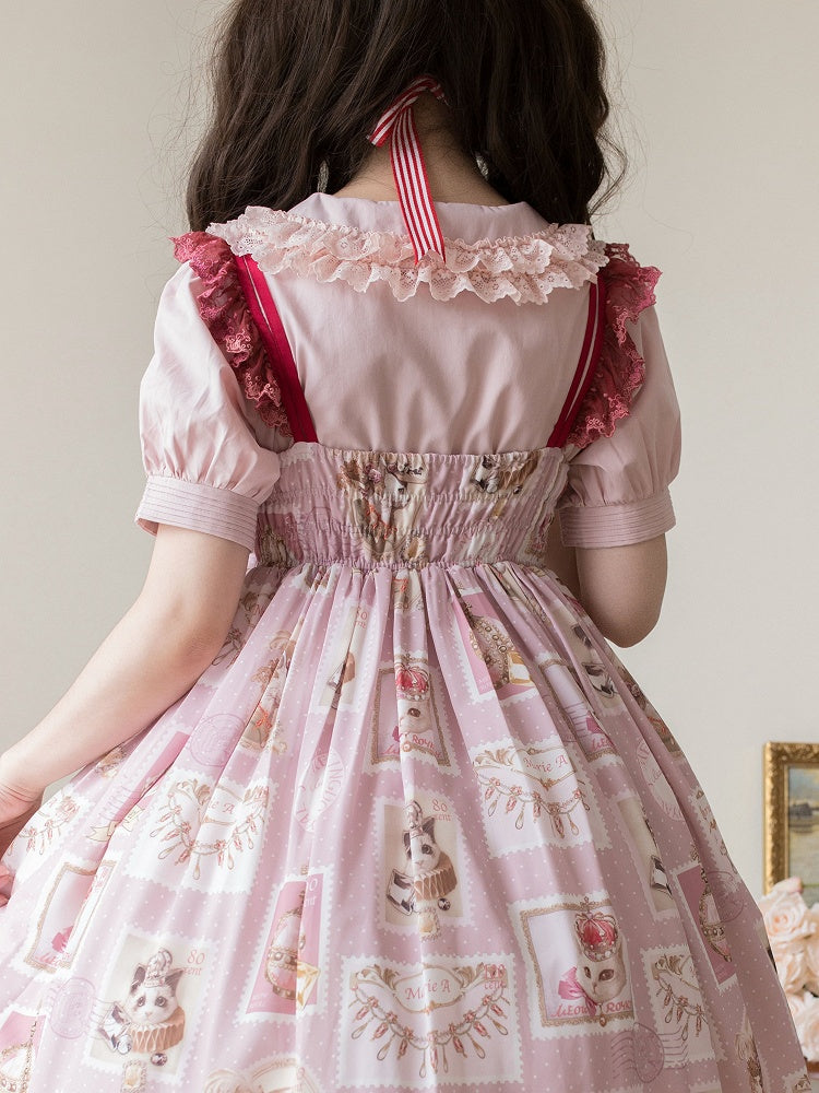 ピンクと白のオールドスクールロリータファッションドレス、蝶結びディテール、ロリータJSKセット