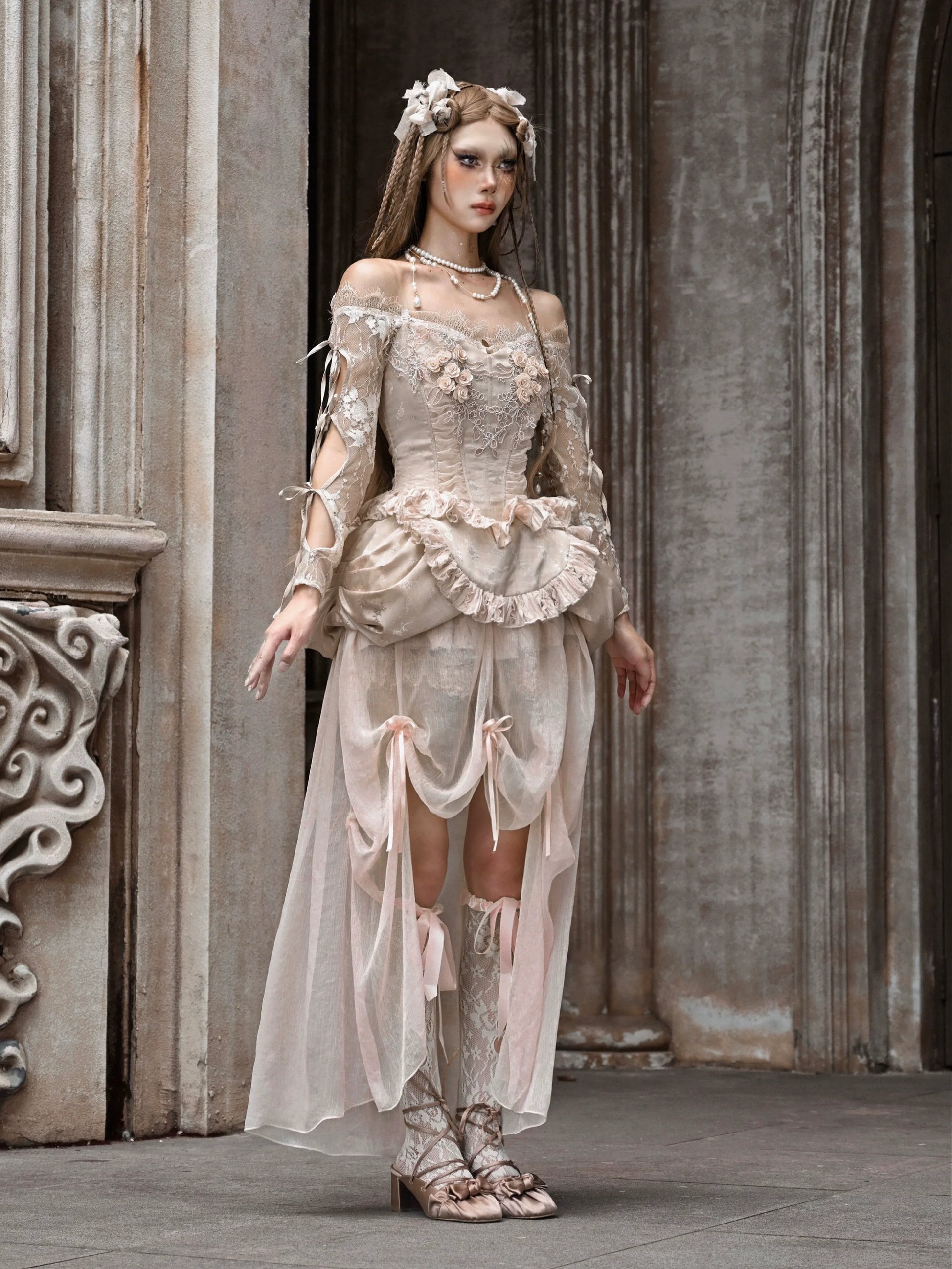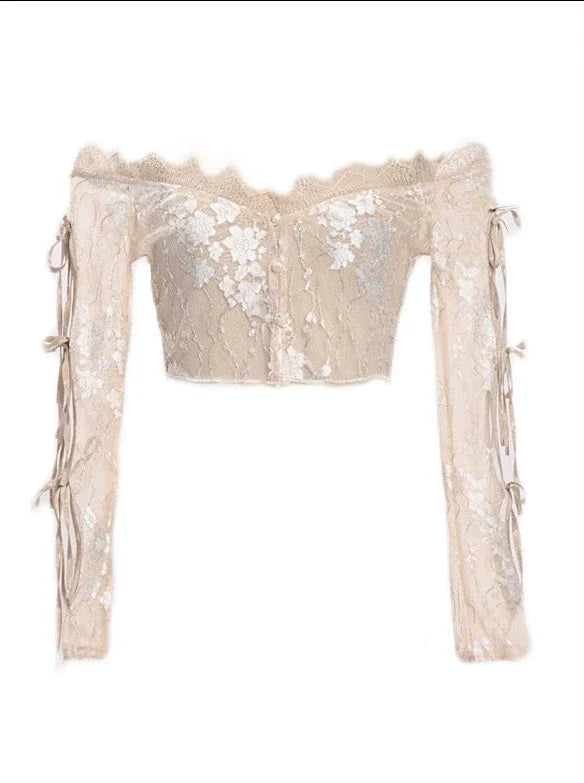 コートストラップレースバレエカーディガントップスクロシェスリーブインナーオフショルダー