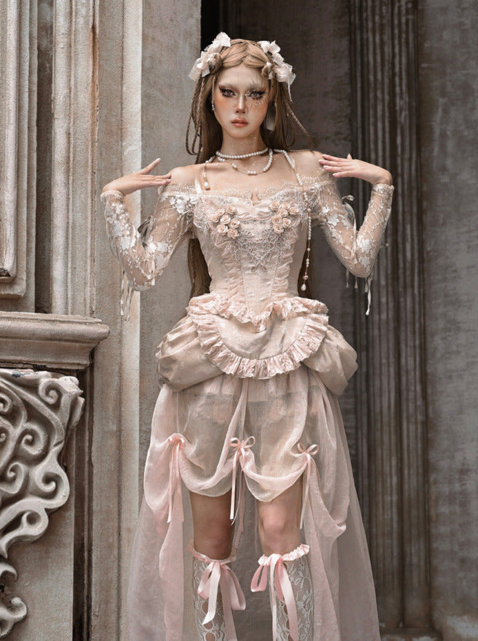 ピンクと白のオールドスクールロリータファッションドレス、蝶結びディテール、ロリータJSKセット