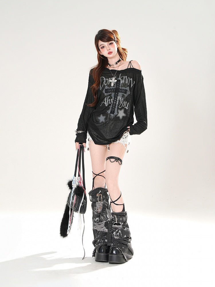 アシンメトリーネックライン レースクロスアップリケ ブラック/ホワイト カバーアップ