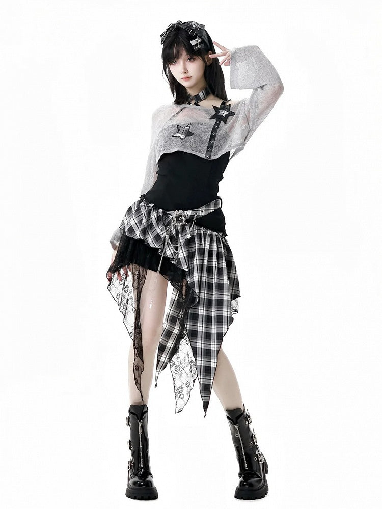 カバーアップ ブラック/グレー スター ダメージ加工 ホールズ パンクロック ストラップ ホローアウト クロップド