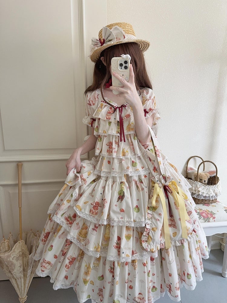 クリーム色のスカートプリントのティアードロリータ、甘いフルーツとデザート