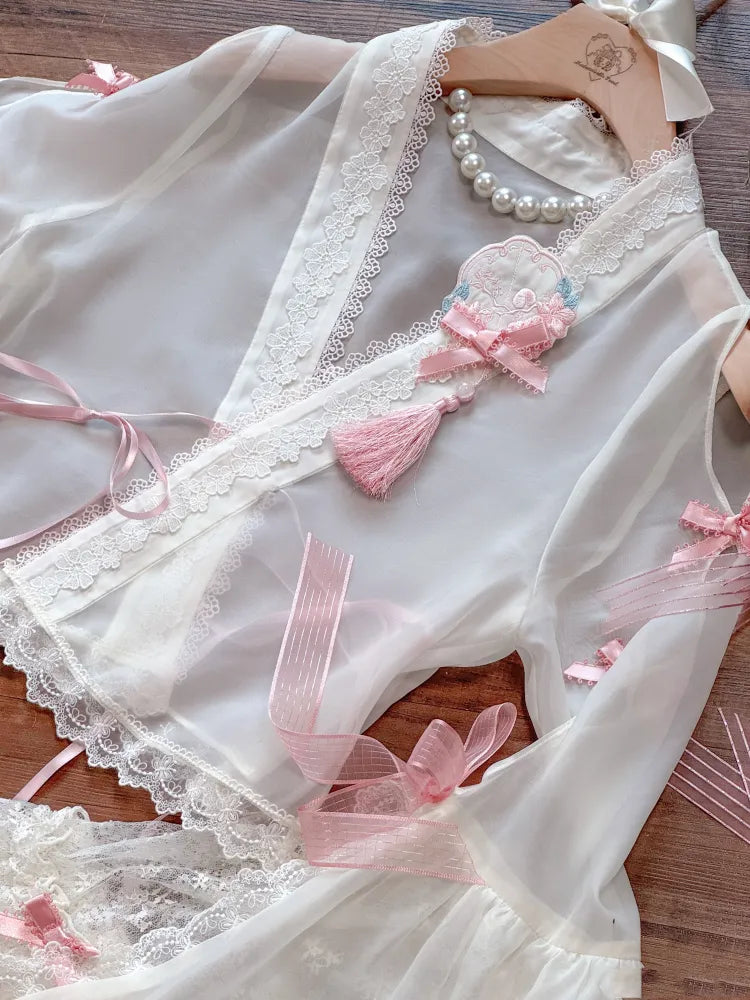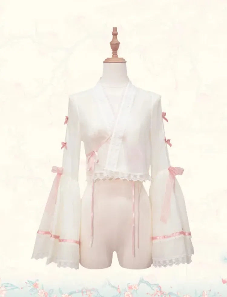 クリーム色のベルスリーブと小さなピンクの蝶結びが付いた漢ロリータブラウス