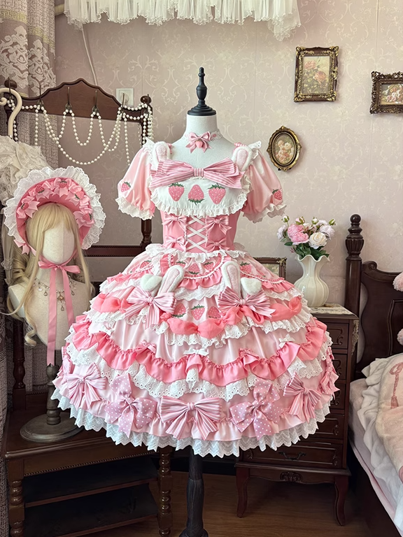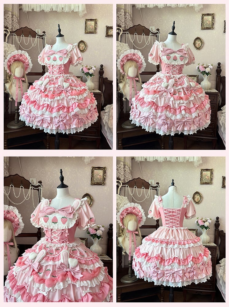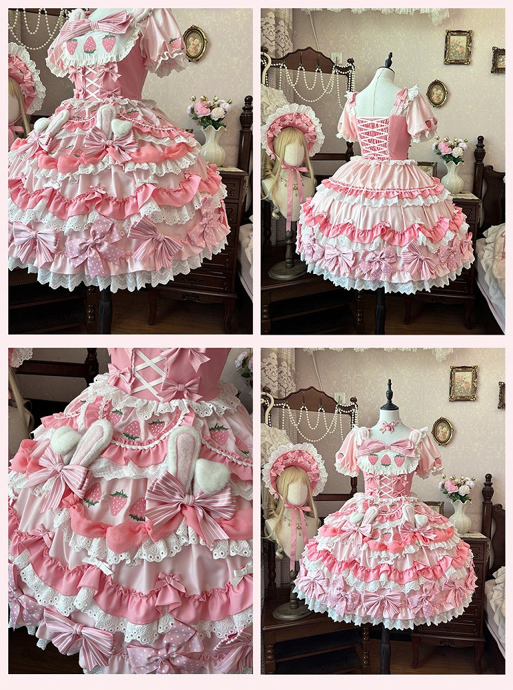 クリーミーなストロベリーバニーピンクのリボンがアクセントのティアードスカートのスイートロリータドレスOP