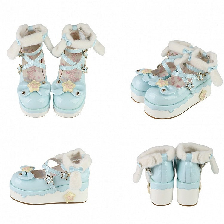 Crisscross Straps, Top Bow & Star Snap PU Green Platforms in Sweet Lolita