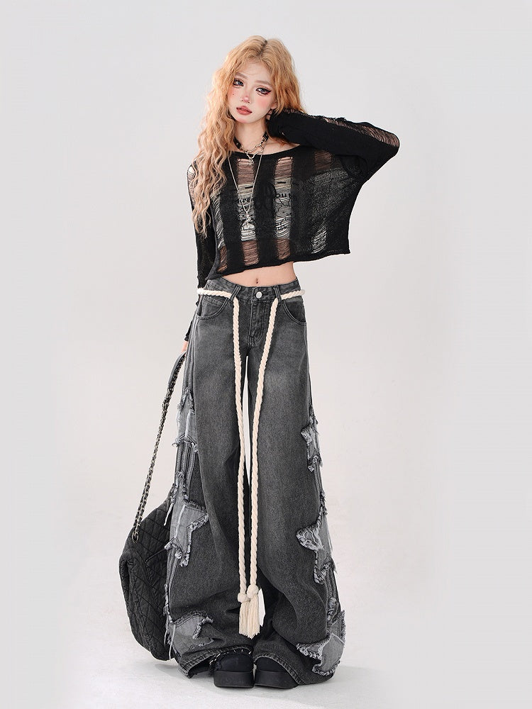 Black Asymmetrical Neckline Crop Knit Top - Intricate Distressed Detailing