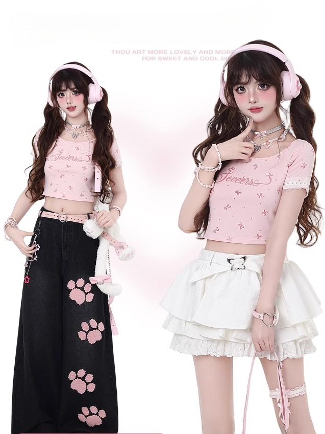 クロップド丈のスイートピンクラウンドネックリボンプリントTシャツ