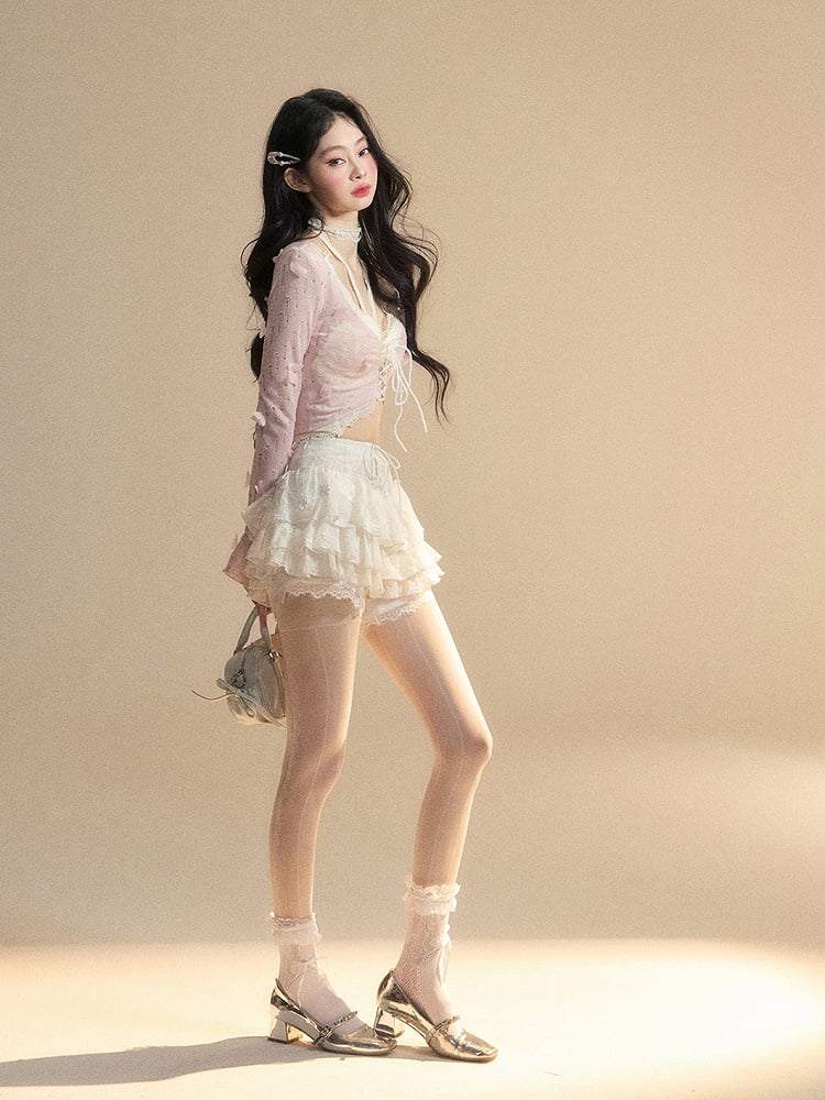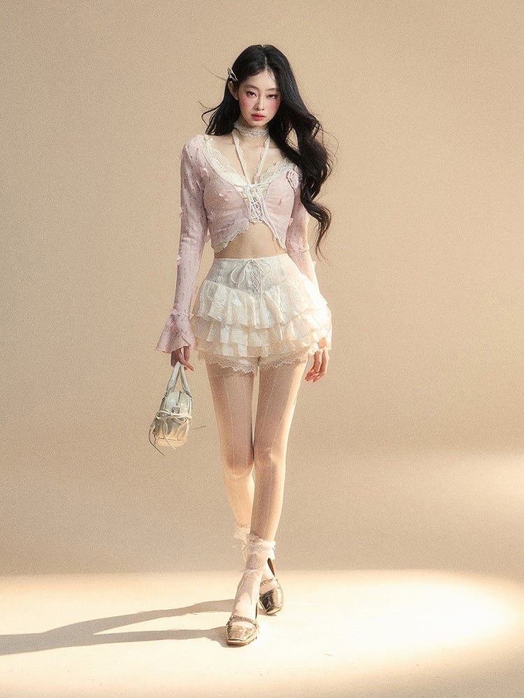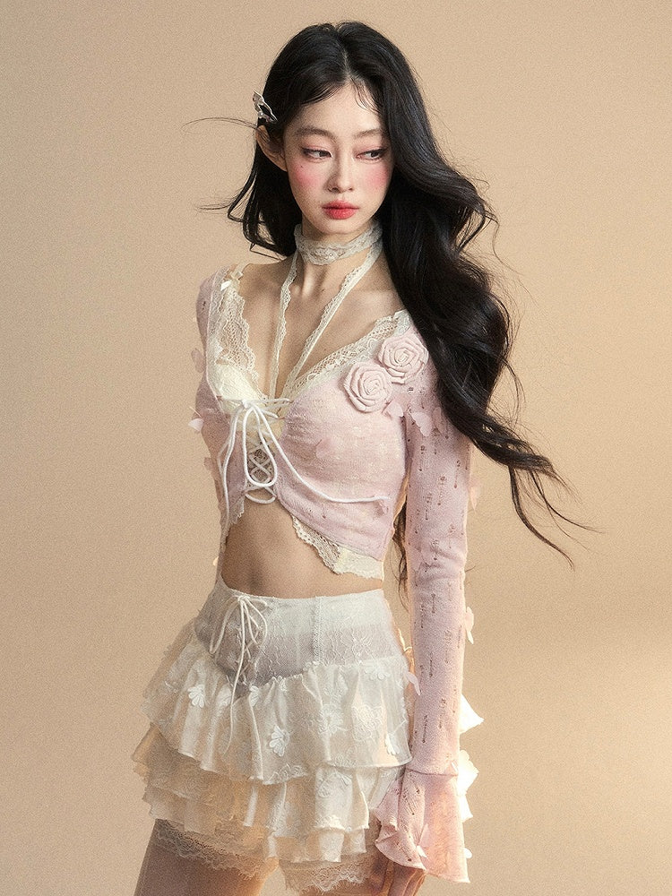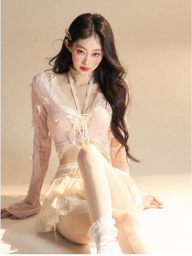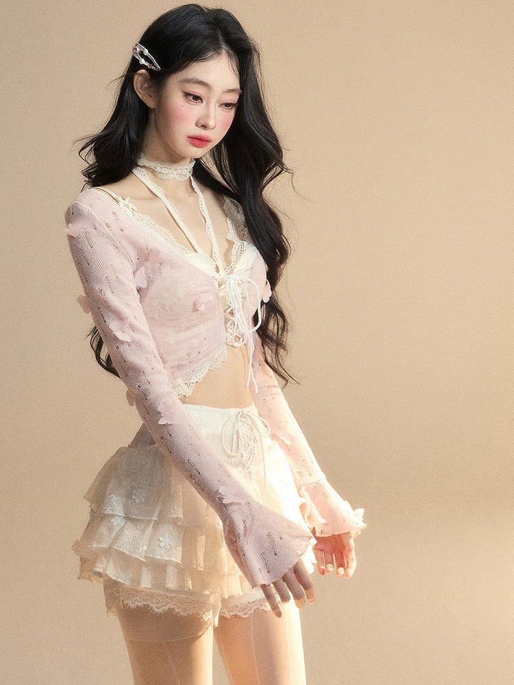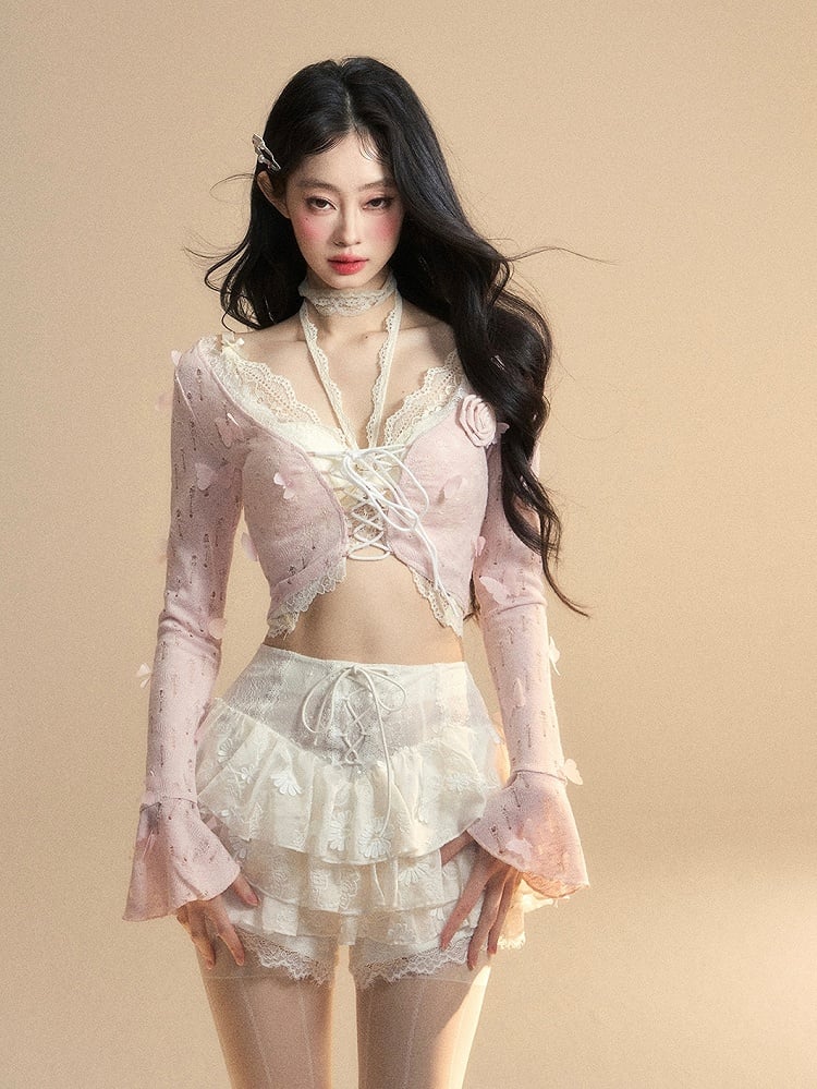 ピンクのベルスリーブ、蝶と花柄の装飾が施された華やかなクロップドトップスとレーストップスのセット