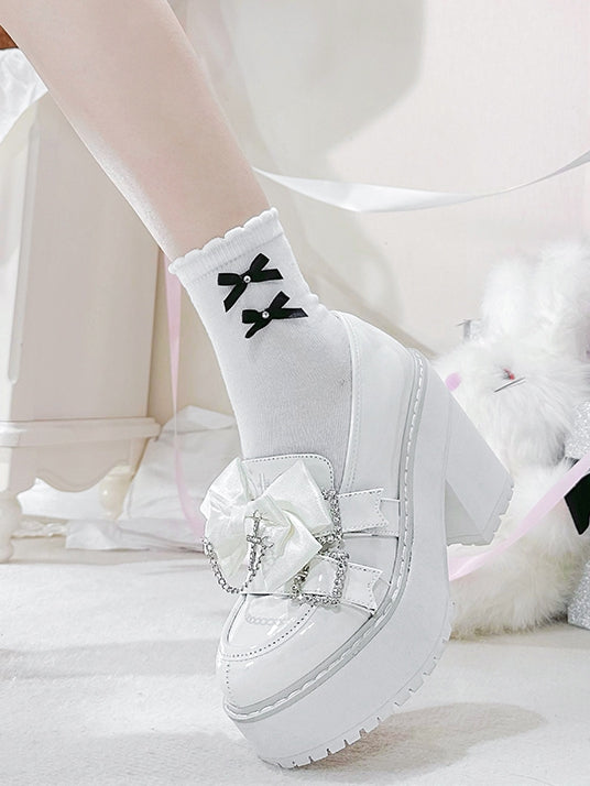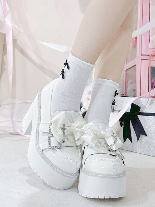 光沢のあるホワイトのジライケイクロスチェーン装飾のリボンとラインストーンのバックルが付いたプラットフォームローファー