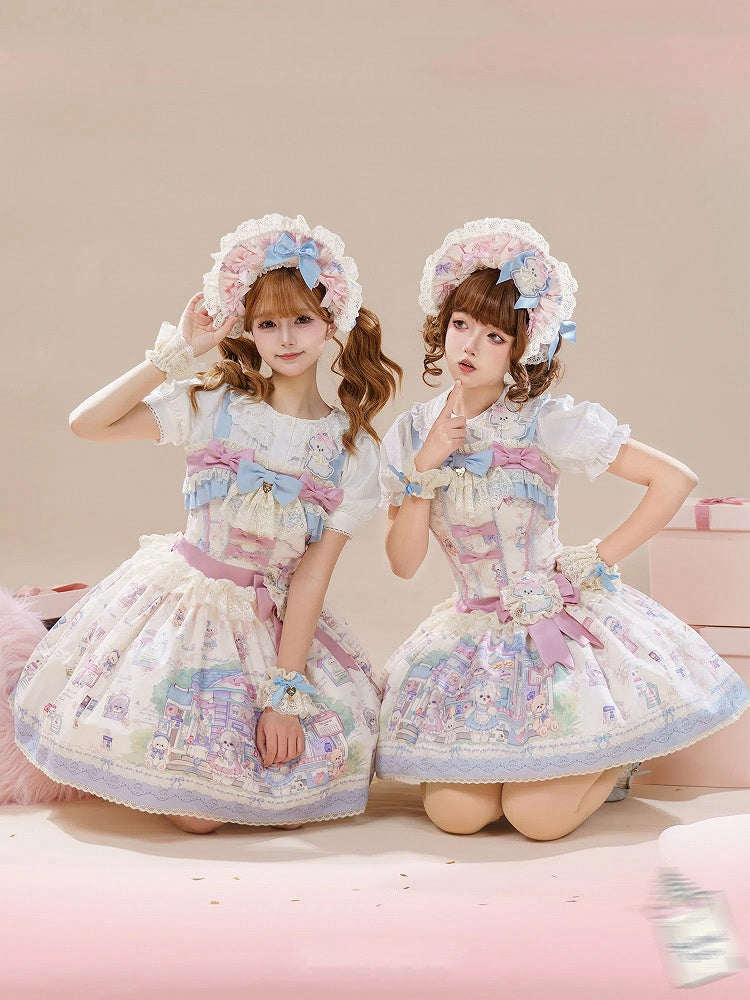 青と白のオールドスクールロリータファッションドレス 蝶結びディテール JSK セット
